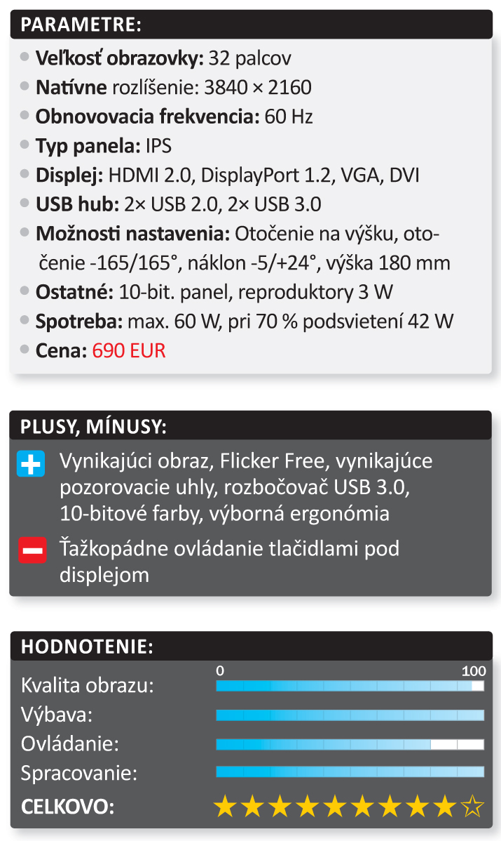 » Zatiaľ čo sme ešte pred pár rokmi s údivom pozerali na 24" monitory s úžasným rozlíšením 1920 × 1200 bodov, dnešným hitom sú 32" s rozlíšením 4K (3840 × 2160 bodov). Keď si takýto kúsok po prvýkrát postavíte na stôl, ohromí vás veľkosť panela. Pamätníci si možno spomenú na TV prijímače s uhlopriečkou 55 cm, tu je však reč o 81,3 cm.