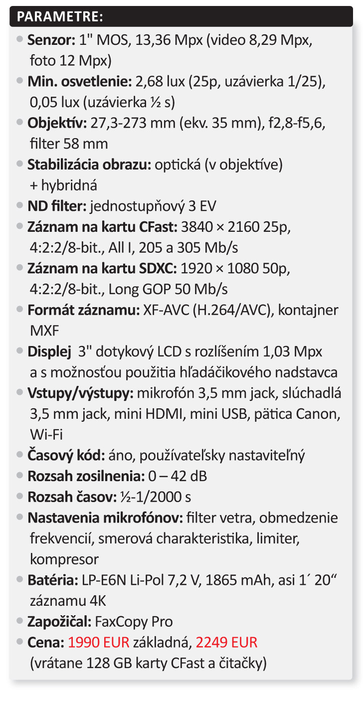 Nechceme však, aby to vyznelo ako nejaká vážna kritika, ide o drobnosti, ktoré sú všetky riešiteľné. Kamera sa nám inak veľmi páčila. Na tele sú k dispozícii 3 programovateľné tlačidlá, na ktoré si môžete priradiť funkcie podľa svojich preferencií. Ovládanie zoomu je iba manuálne, je však úplne mechanické, takže reaguje okamžite s pohybom krúžku. Oba krúžky objektívu sú vybavené drážkami na pripojenie externej ovládacej mechaniky. Zvuk sa dá nastavovať ručne cez menu alebo použiť niektorý z prednastavených zvukových programov. Záznam je čistý, bez ruchov. V tichom prostredí môžete dočasne vypnúť vstavaný ventilátor. Kamera je vybavená vstupom na mikrofón aj výstupom na slúchadlá na 3,5 mm konektoroch jack. Sánky na vrchnej strane sú štandardné pre príslušenstvo značky Canon.