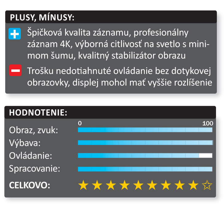 Tak ako sme konštatovali na začiatku, Canon prišiel v podobe XC10 s jedinečným prístrojom, ktorý v podstate nemá žiadnu priamu konkurenciu. Záznamovými možnosťami sa dá prirovnávať iba k prístrojom s cenovkami o niekoľko rádov vyššími. Ruka v ruke so záznamom ide aj snímacia časť, ponúkajúca naozaj výbornú kvalitu obrazu vo full HD aj 4K rozlíšení, vysoký dynamický rozsah, podporený aj použitím režimov V-log, a veľmi dobrú citlivosť na svetlo s minimom šumu. V horších svetelných podmienkach možno využiť ISO 1600 bez pozorovateľného šumu. V extrémoch sa dá ísť až do ISO 6400 bez výraznej straty kvality záznamu. Pre kreatívnych filmárov s obmedzeným rozpočtom môže byť zaujímavý nákup XC10 ako špičkovej full HD videokamery, kde si vystačia s bežnými kartami SDXC. A časom, keď určite dôjde aj k poklesu cien kariet CFast 2.0, jednoducho možno nákupom karty doplniť aj profesionálny 4K záznam.