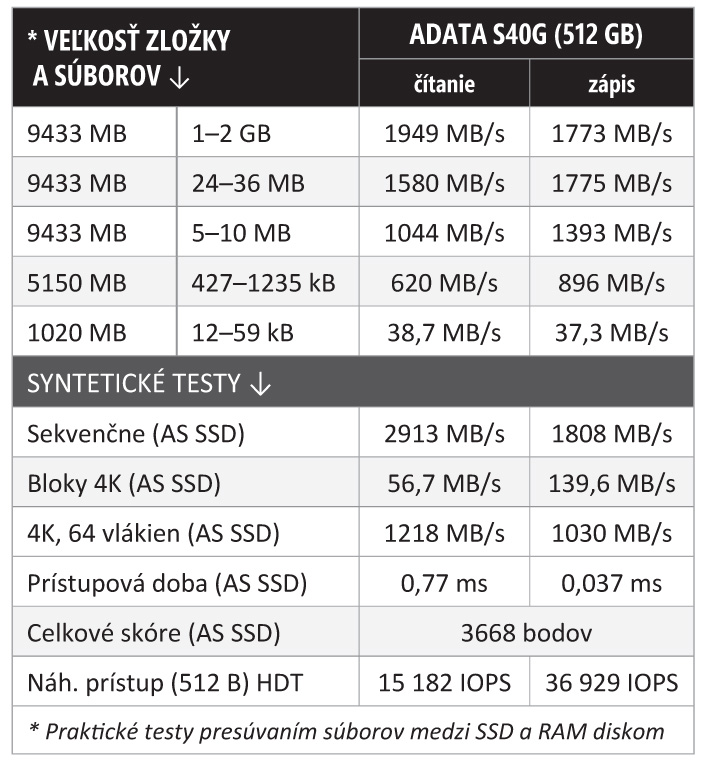 Rýchlosť sekvenčného čítania a zápisu je výborná. Najmä pri vzorke väčších súborov (od 24 MB) a veľkých súborov nemá široko-ďaleko rovnocennú konkurenciu. Dopomáha k tomu i objemný buffer MLC (čítate správne, S40G nepoužíva techniku SLC, ako býva obvyklé pri SSD s NAND TLC). Sekvenčný zápis sa prepadáva po zapísaní až 180 GB, potom klesá na 170 – 230 MB/s. To je nízka rýchlosť, ale skoro to ani nestojí za reč, keďže v praxi sa s ňou nestretnete (neprečerpáte urýchľovací buffer). Výkon čítania sa pri menších súboroch je už vzhľadom na cenovú kategóriu S40G je už priemerný. Doba náhodného prístupu k veľmi malým súborom je dokonca až podpriemerná, a hoci aplikačný výkon nie je slabý, v tomto smere ADATA rekordy netrhá.