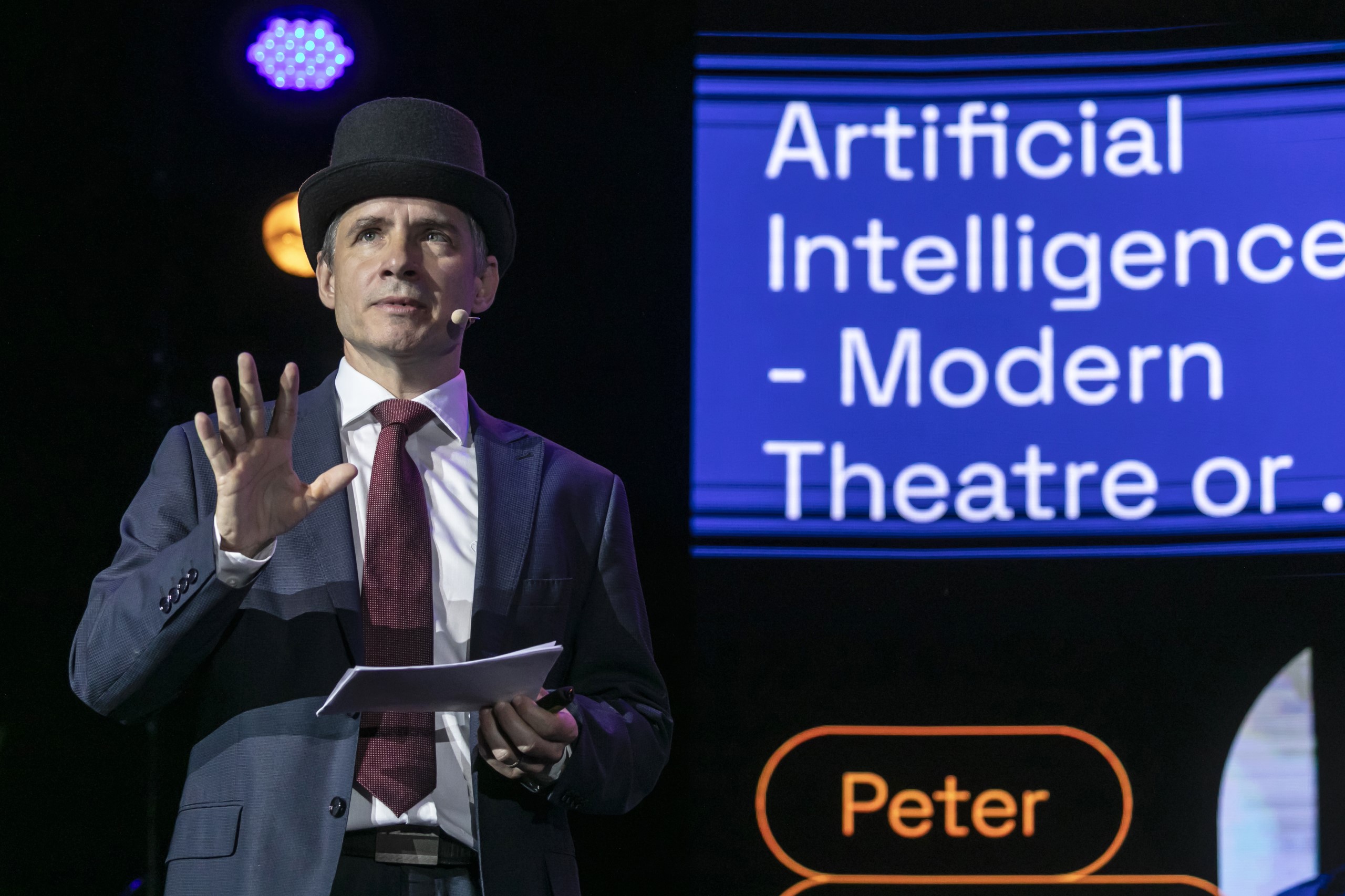 Peter Morávek, CEO, SOFTEC, počas otvorenia konferencie v priestoroch Divadla Aréna: „AI nie je o tom, nahradiť človeka, ale naučiť sa s ňou žiť a rozumne ju využiť. A hlavne si to treba ‚odmakať‘“.