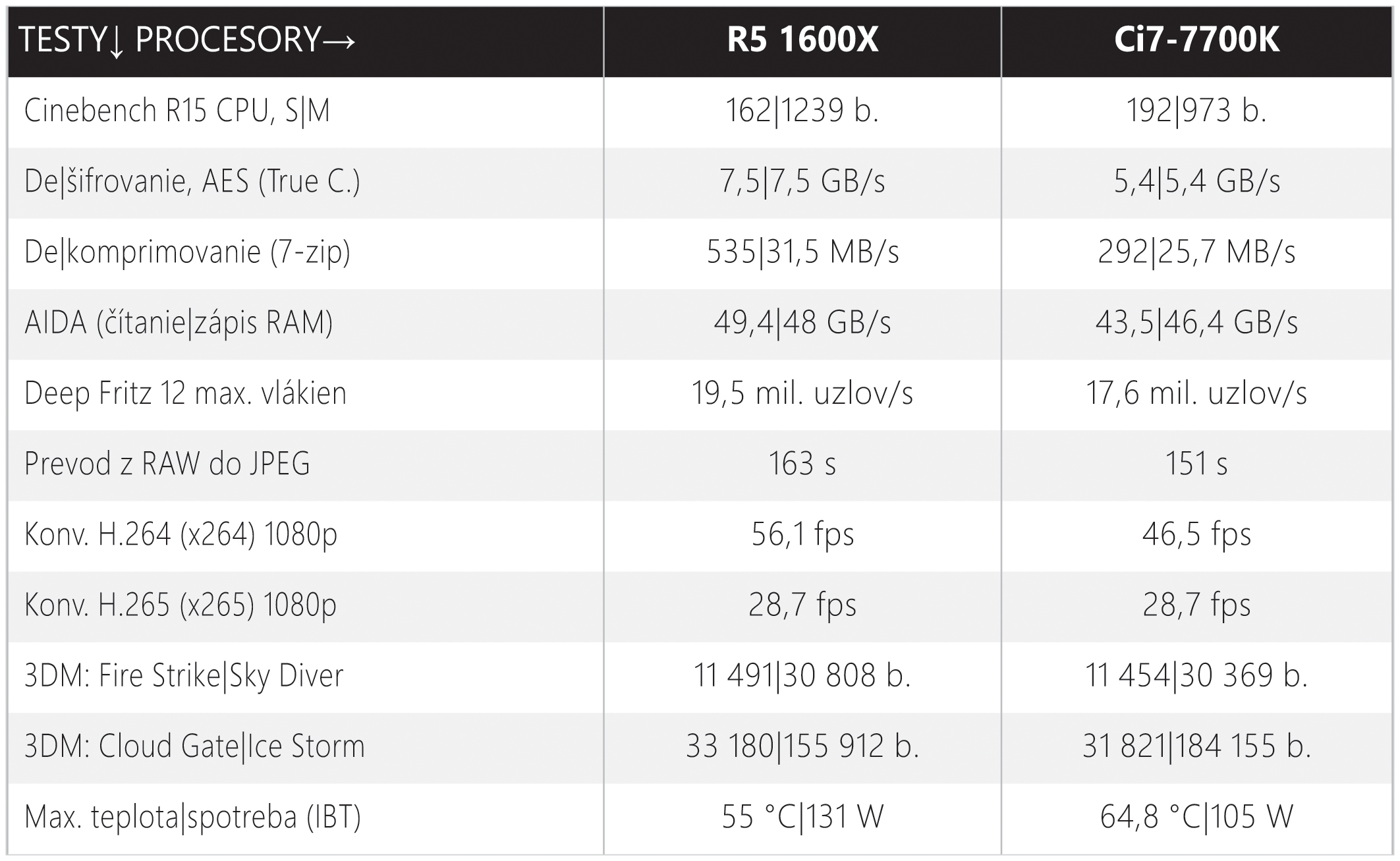 Rýchlosť konverzie videa kodekom H.265/HEVC je vyrovnaná, no s H.264 je už R5 1600X o poznanie svižnejší. Vďaka vláknam navyše je čip AMD pri renderovaní rýchlejší spravidla aspoň o 20 % a výkonnostný nárast pri šifrovaní je ešte výraznejší. Efektivita čiže výkon na watt v prípade Ryzenu je na nerozoznanie od konkurenčného procesora Kaby Lake, čo je v jadre architektúra, ktorú Intel ladí v tomto smere už roky. Pre AMD je to však oproti predošlému Bulldozeru obrovské zlepšenie.