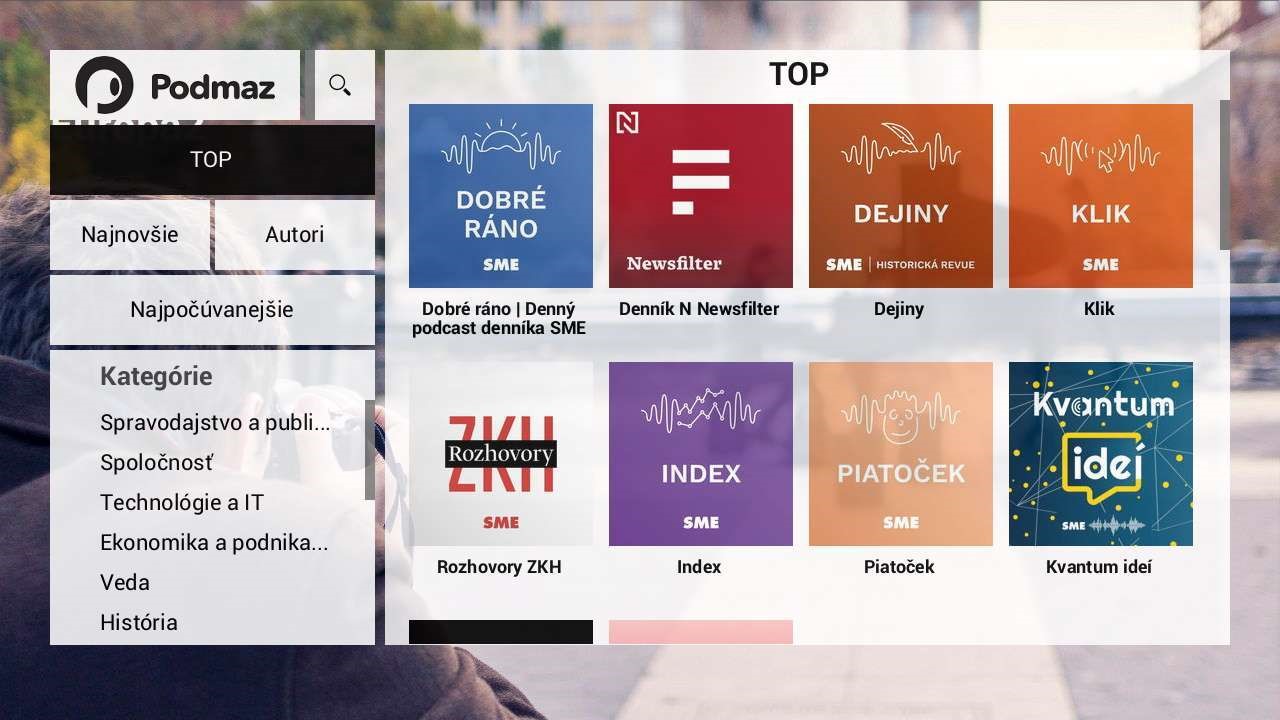 Fanúšikovia podcastov si môžu vypočuť najobľúbenejšie slovenské podcasty ako napr. satirický Piatoček, Vražedné psyché, Dejiny, Index, Nezhasínaj i Kriminálne spisy. Každý z podcastov má aj krátky popis a archív, vďaka čomu sa dostanete k viacerým epizódam vo vami zvolenom čase. Rozhodnutie, aký podcast zvoliť uľahčí kategória TOP, filtrovať viete tiež podľa autora, podľa kategórie alebo si vybrať zo zoznamu najčítanejších či najpočúvanejších.