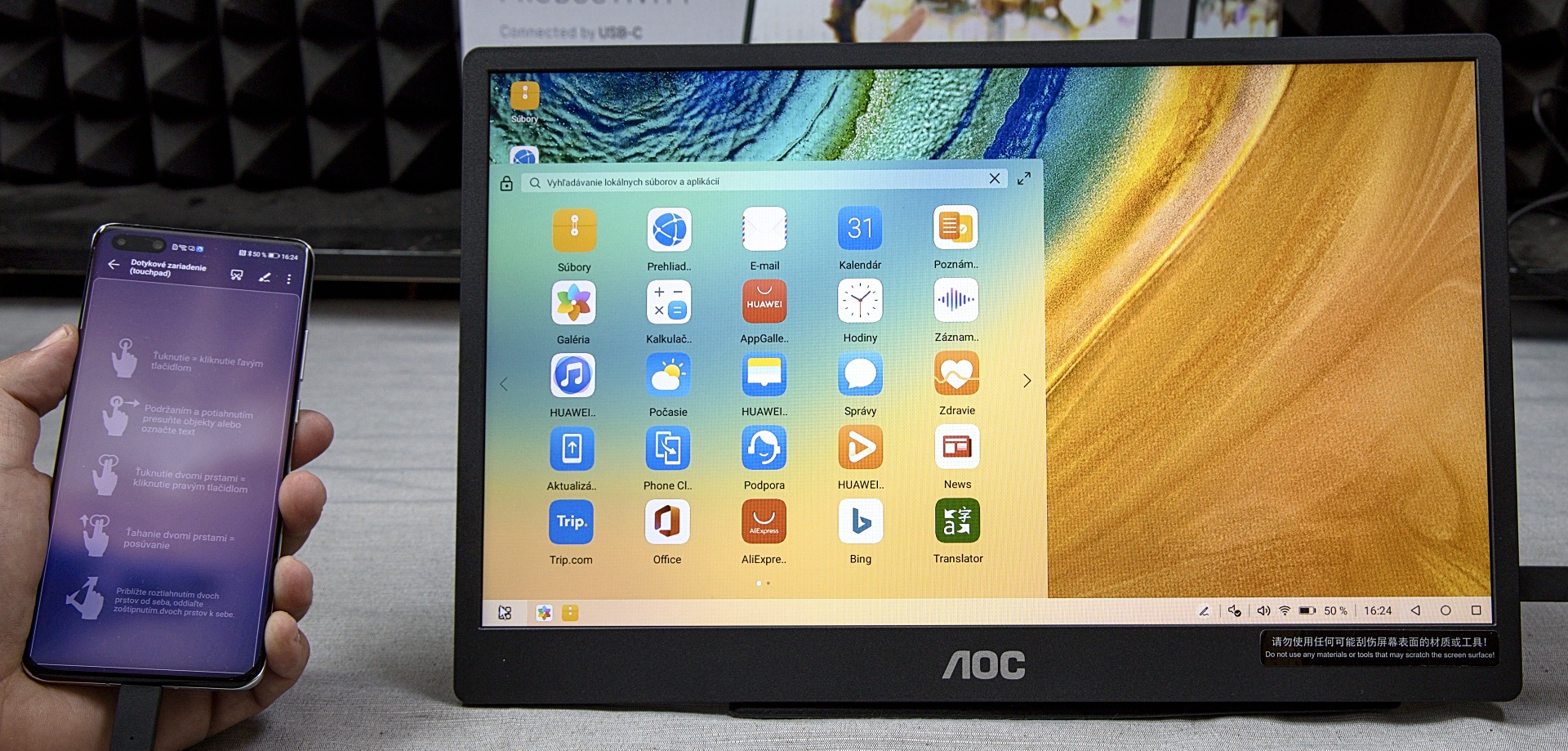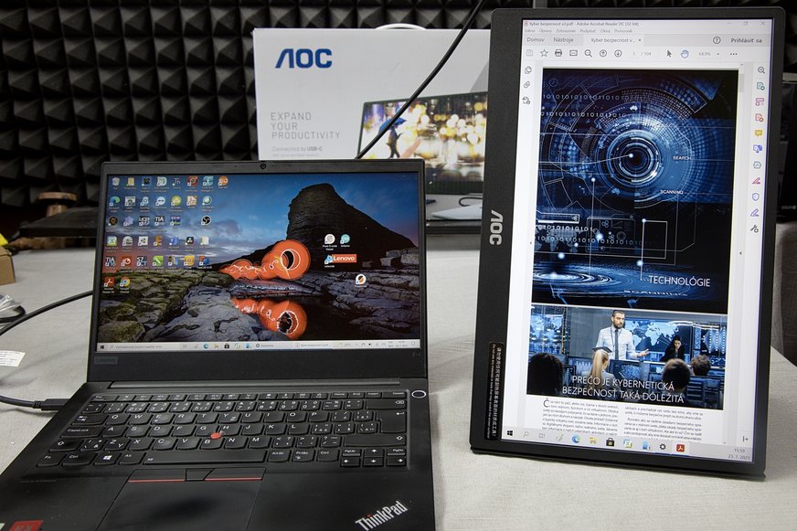 Pri testovaní som využíval režim rozšírenej obrazovky a keď som pracoval s dokumentmi, tak monitor AOC 16T2 som mal v stojane na výšku, takže som mohol zobraziť podstatne väčšiu časť dokumentu ako pri práci s monitorom na šírku. Monitor sa dá pripojiť aj k smartfónom, ktoré podporujú režim práce na veľkej obrazovke. Takýto režim podporujú napríklad vlajkové modely Samsung a Huawei.