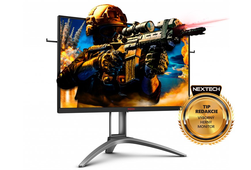 Monitor sa dodáva s matnými plastmi v kombinácii čiernej a titánovej farby, ktoré sa používajú na rám a zadný kryt. V strede pod displejom je červené logo AGON. Displej má z troch strán zúžený rámček s tenkým 1,5 mm čiernym plastovým okrajom. Na oboch stranách sú výsuvné háčiky na slúchadlá. Monitor stojí na masívnom kovovom trojnohom stojane, kde je ukotvený výťah so závesom, ktorý umožňuje široké možnosti nastavenia výšky, otáčania, a sklonu. Do polohy pivot displej, samozrejme, pre technológiu TN nenastavíte. V strede dole je malý ovládací joystick, ktorého stlačením sa monitor aj zapína. Okrem toho je však v balení kruhový káblový ovládač umožňujúci kompletné a veľmi pohodlné ovládanie monitora a nájdete na ňom aj trojicu veľkých tlačidiel na rýchlu voľbu prednastavených používateľských režimov. Ovládač má červené LED osvetlenie po obvode, aby ste ho v prítmí nemuseli hľadať. Ovládanie patrí k najlepším na trhu. Na zadnej strane monitora je veľký LED kruh, ktorý umožňuje nastavenie najrôznejších svetelných efektov. Ako som písal v úvode, displej s rozlíšením 2560 × 1440 využíva panel AU Optronics TN (Twisted Nematic) s antireflexnou povrchovou úpravou Medium AG Coating. Panel je podsvietený pomocou W-LED a dosahuje jas podľa nášho merania až 398 nitov. Monitor pracuje s frekvenciami od 48 Hz do 240 Hz a podporuje technológie AMD FreeSync aj NVIDIA G-Sync.