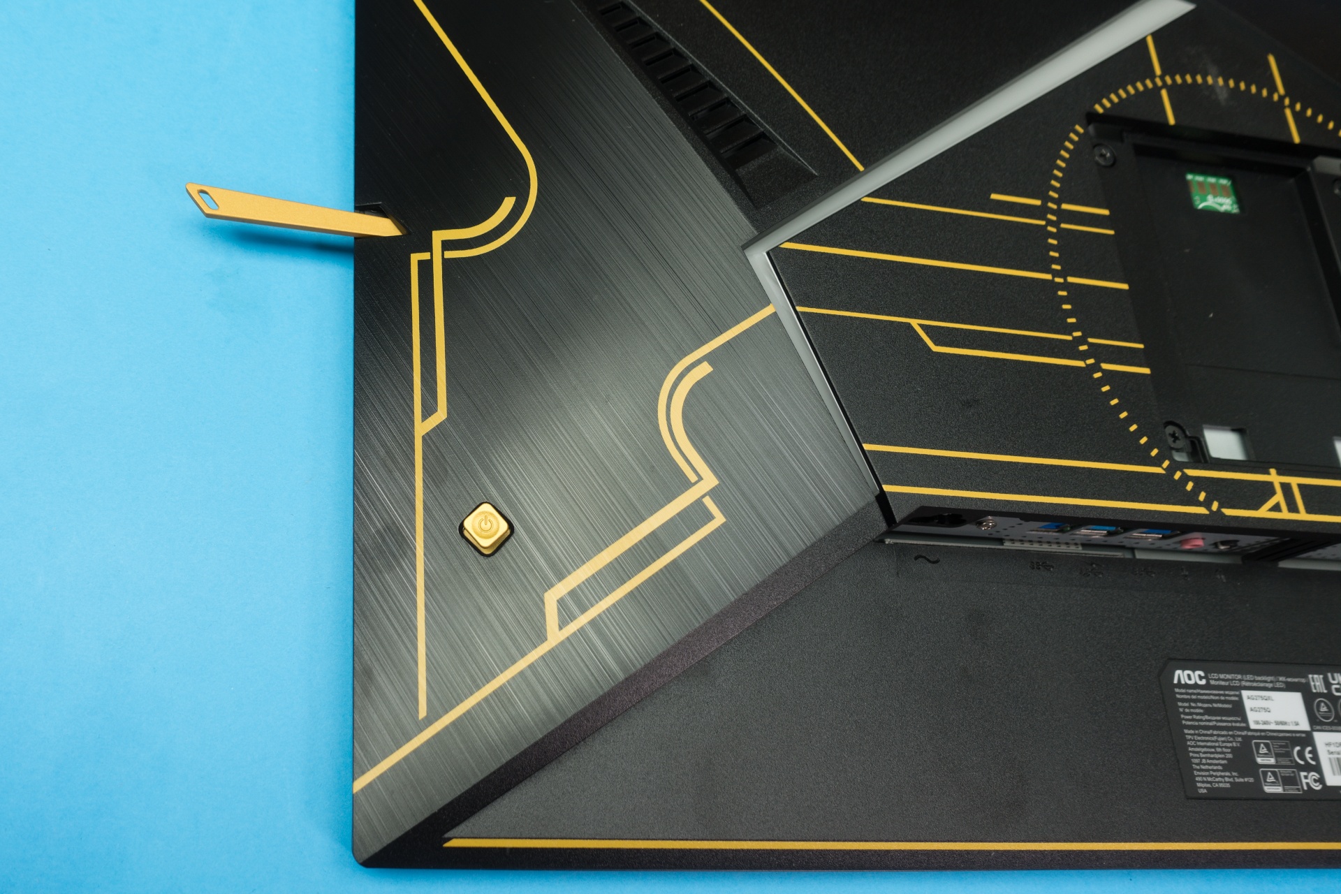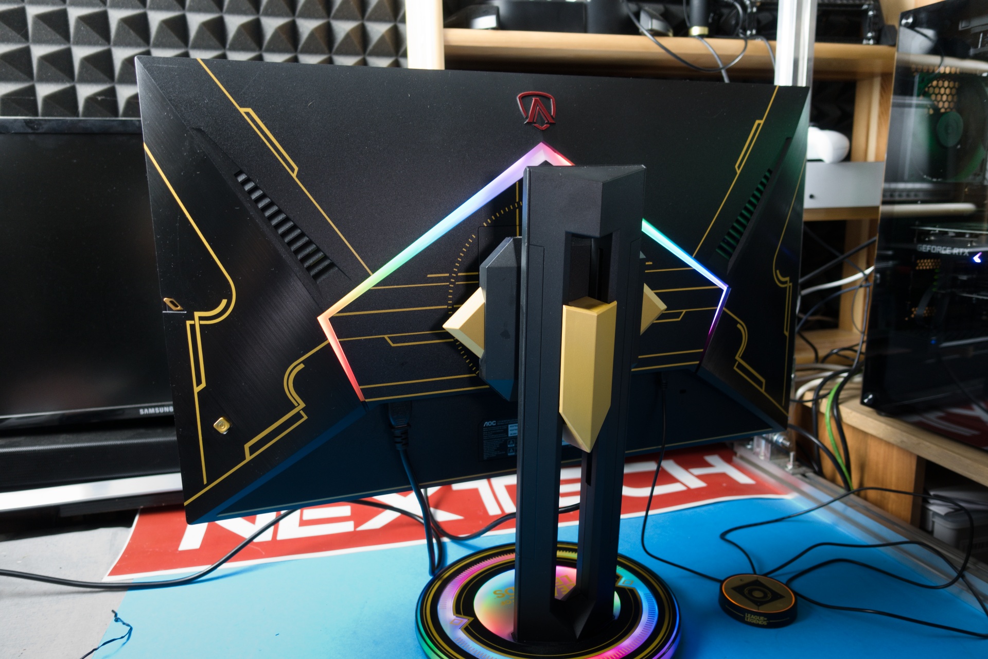 Monitor má matné čierne šasi so zlatými ozdobnými prvkami a RGB podsvietením jednak na zadnej strane a taktiež v kruhovom podstavci. Zadnú stenu totiž návštevník pri príchode do hráčovho „brlohu“ uvidí ako prvú. Panel monitora sa dá naklopiť v rozsahu uhlov 3 ° dopredu a 21° dozadu a výškovo nastaviť v rozsahu 13 cm. Kruhový stojan je pevný a stabilný.
