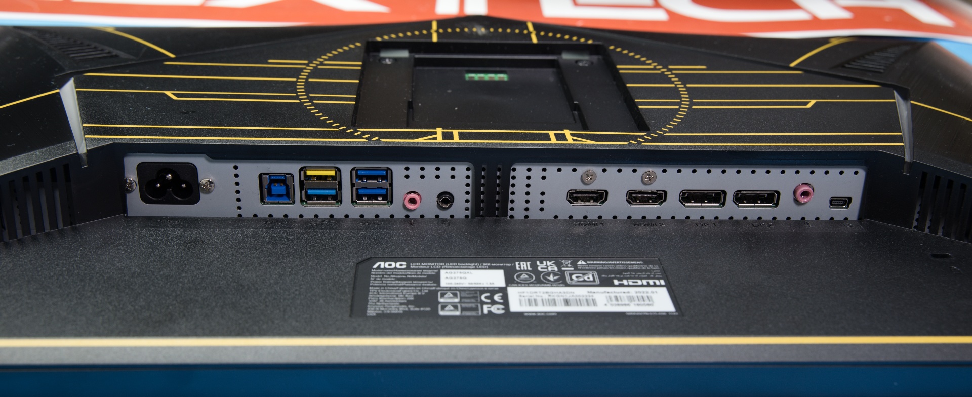 V ľavej časti je konektor na pripojenie sieťovej šnúry, USB hub a dva audio konektory. Jeden z USB portov má vnútornú lištu žltú, tento port podporuje rýchle nabíjanie pripojených zariadení. V pravej časti sú dva konektory HDMI, dva konektory Displey Port, audio konektor a úplne vpravo micro USB na pripojenie ovládača QuickSwitch. Monitor má vstavané aj stereo reproduktory s výkonom 2 x 5 W, ktoré hrajú celkom obstojne, avšak priaznivci kvalitného zvuku použijú buď slúchadlá, alebo externé reproduktory.