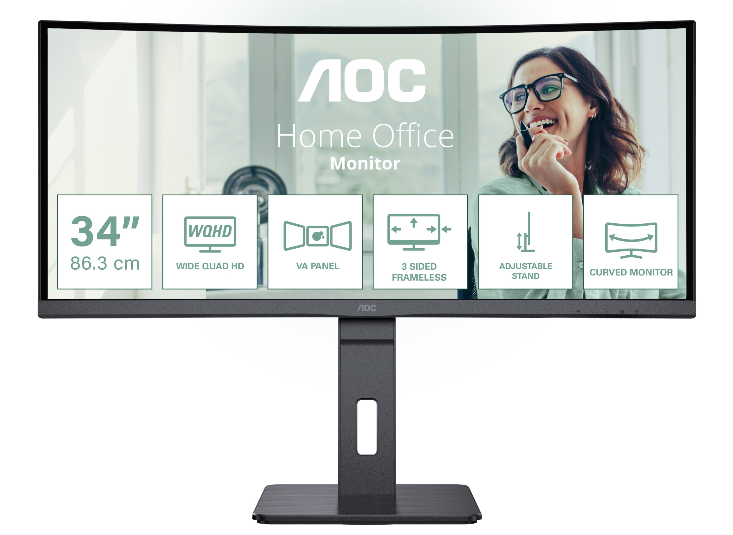 Veľkosť obrazovky: 34 palcov, typ panela: VA, zakrivenie 1500R, antireflexná úprava, natívne rozlíšenie: 3440 × 1440, latencia (G2G): 4 ms, Adaptive Sync 100 Hz, kontrastný pomer: 3000:1, pozorovacie uhly: 178° horizontálne aj vertikálne, KVM, konektivita: 1× HDMI 2.0, DisplayPort 1.4, USB-C 3.2 Gen. 1 (režim DP alt, upstream, napájanie do 65 W), eternet RJ-45, výstup na slúchadlá (3,5 mm), reproduktory 2 × 5 W, mikrofón, napájanie: interný zdroj, rozmery 808,34 × (482,44~611,03) × 275,13 mm (so stojanom), hmotnosť: 10 kg (s podstavcom)