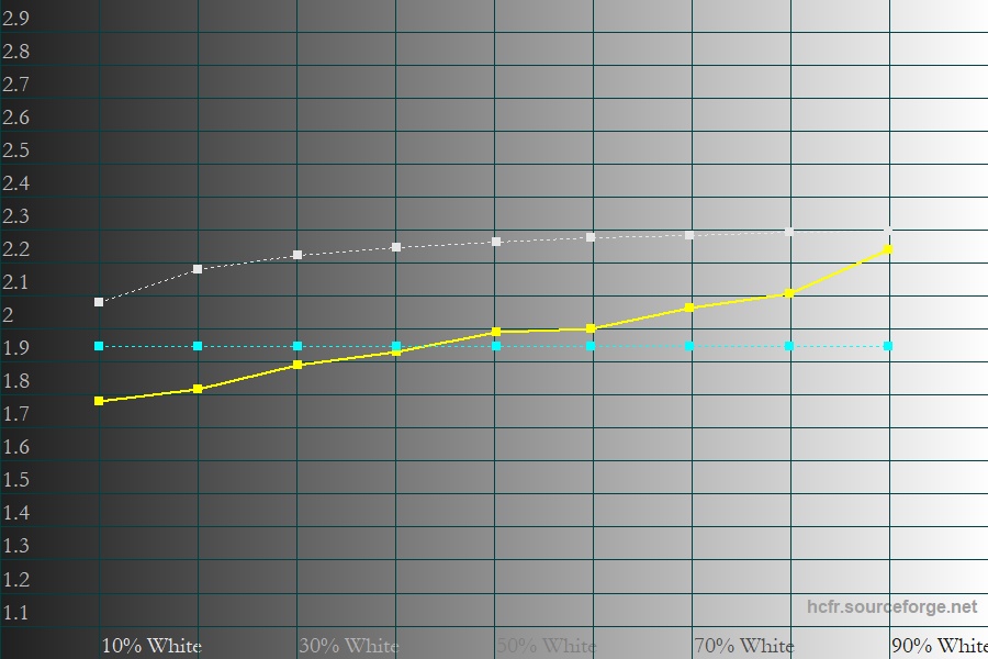 V herných režimoch FPS a racing sú farby na intenzívnejší zážitok trochu presaturované. Najvarovanejšiu krivku gamy má paradoxne režim RTS, v ktorom sa na herných monitoroch často zlievajú svetlejšie odtiene. Tu to síce neplatí, ale priemerná hodnota gamy je 1,9 rovnako ako pri väčšine ostatných predvolených režimov. Svetlejší obraz (s priemernou hodnotou gamy 2,1) je iba v režime FPS. Pre „používateľský“ režim však môžete gamu prirodzene regulovať po jemných krokoch a zostať pri úrovni, ktorá vám najviac vyhovuje.