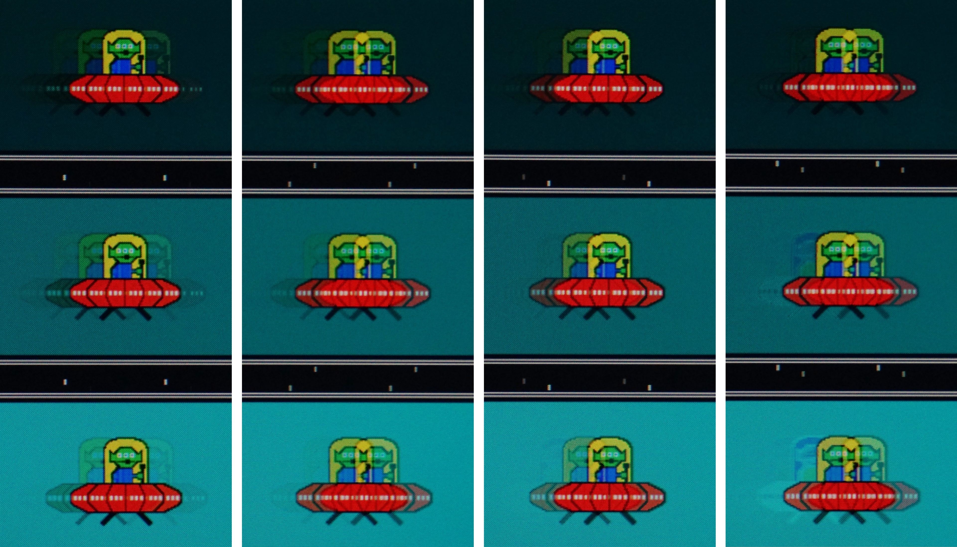 Vplyv nastavenia zrýchlenia (overdrive) na intenzitu ghostingu. Zľava, off, weak, medium a strong