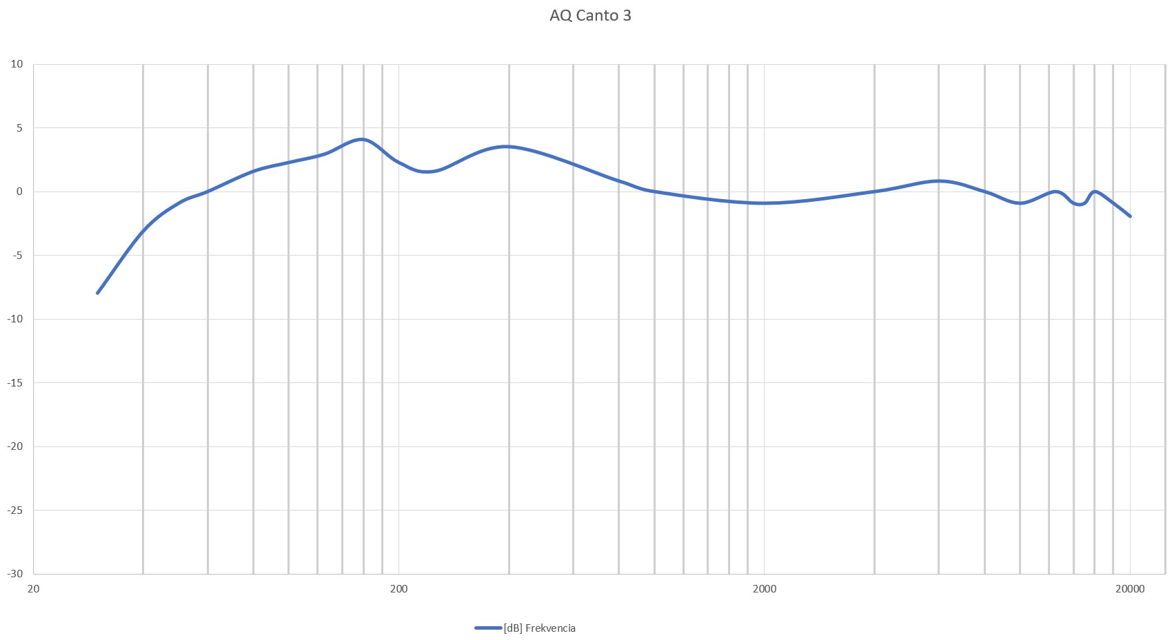 Meranie frekvenčnej charakteristiky prezradilo, že v prípade AQ Canto bol výrobca zbytočne skromný, na frekvencii 45 Hz bol útlm v porovnaní s frekvenciou 1 kHz len 3 dB, pri 40 Hz 6 dB a útlm 8 dB som nameral pri frekvencii 36 Hz.