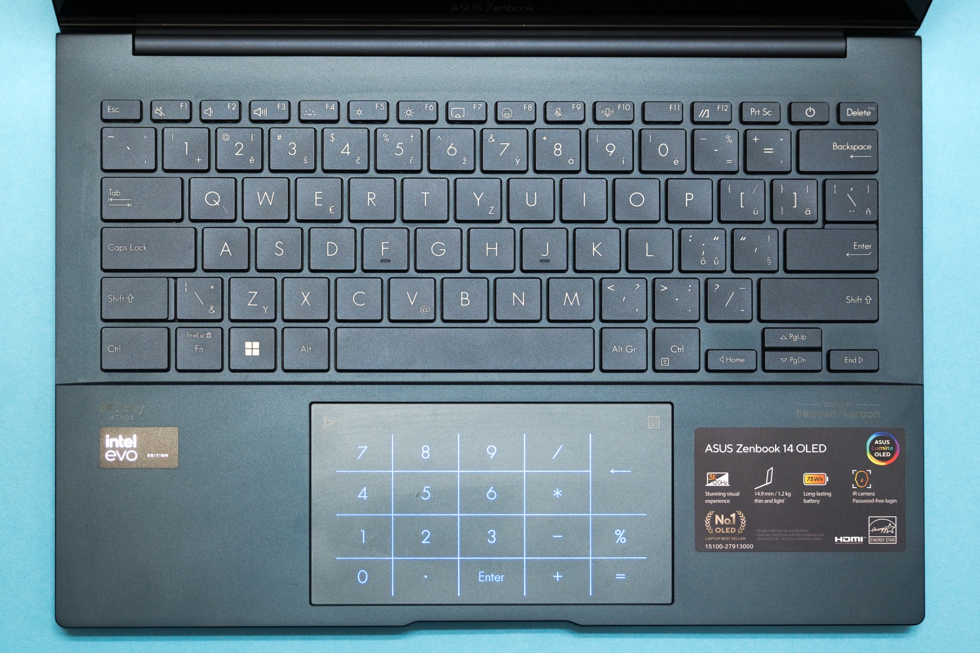 Klávesnica s podsvietením je kvalitná s príjemným zdvihom 1,4 mm, takže sa na nej dobre píše. S výnimkou kurzorových kláves, ktoré málokto používa majú alfanumerické klávesy plnú veľkosť. Touchpad s príjemným skleneným povrchom môžete prepnúť do režimu, keď je na ňom zobrazená dotyková numerická klávesnica.