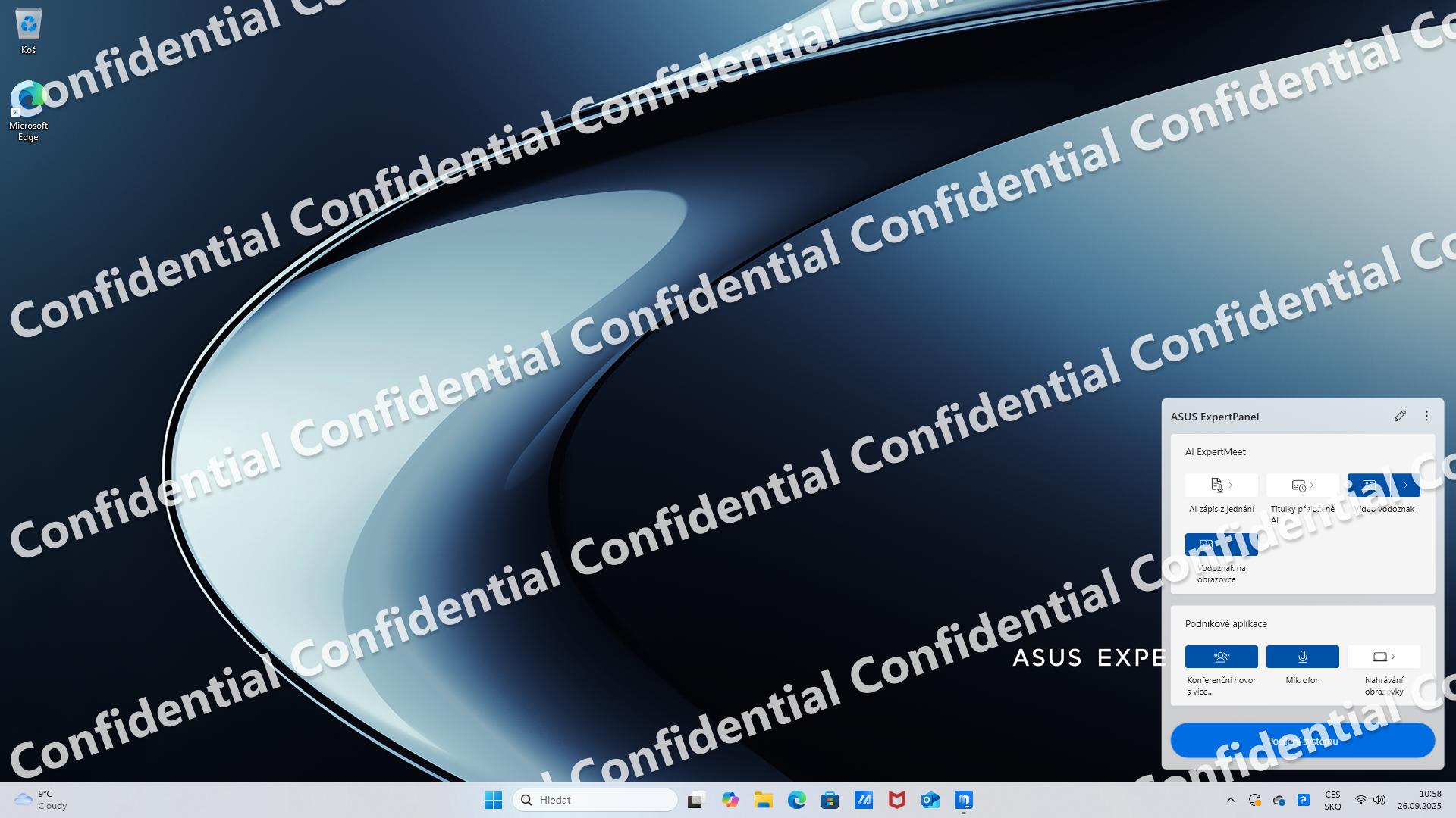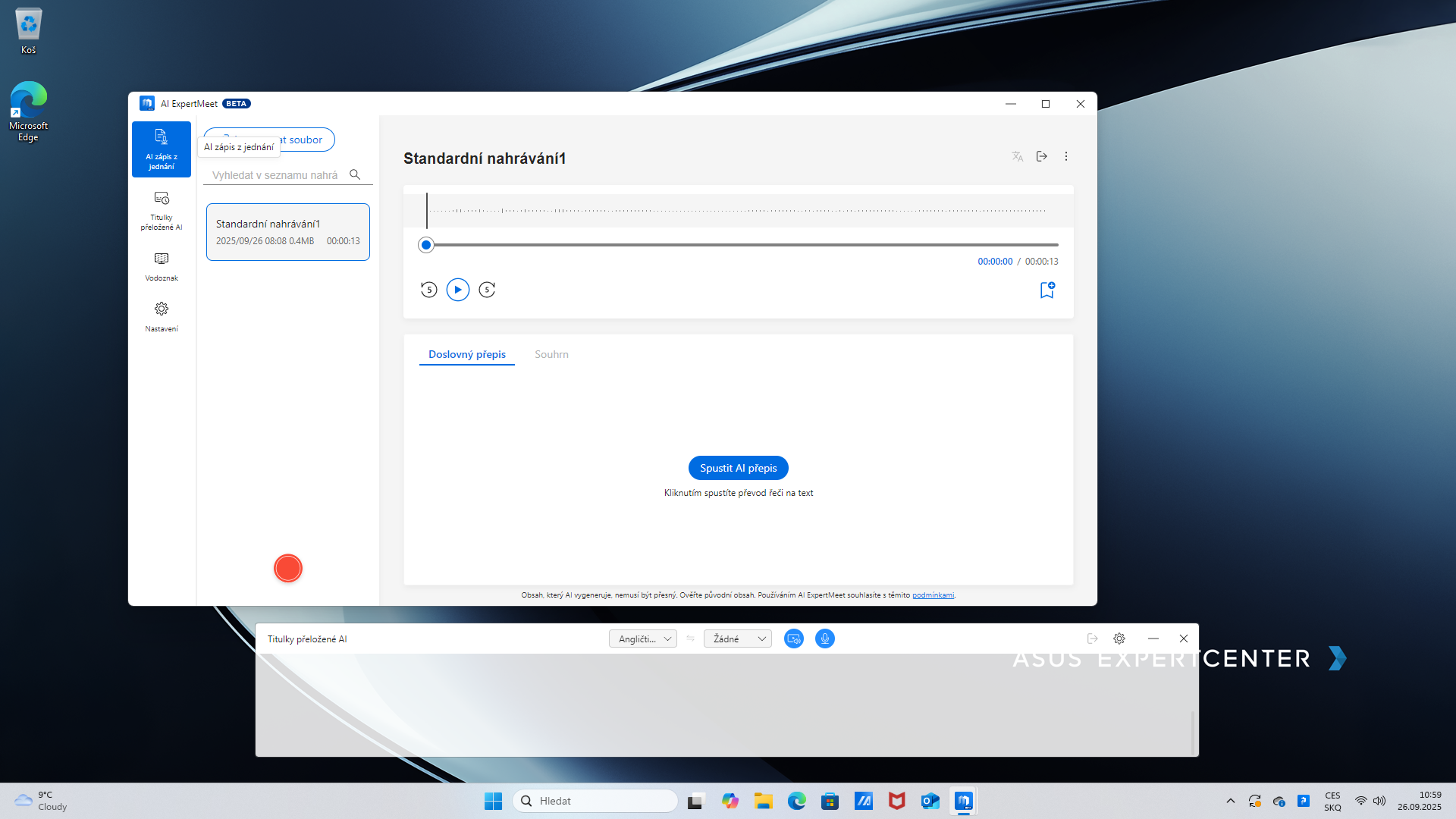 Integrálnou súčasťou Windows 11 Pro je Microsoft Copilot. V počítači sú predinštalované ďalšie AI aplikácie od ASUSu, AI Expert Meet a AI Expert panel. Po prvom spustení AI Expert Meet sa nainštalovala 6-gigabajtová aktualizácia, podľa objemu súdim, že vrátane lokálneho modelu AI. AI umožňuje rozostrovanie pozadia obrazu a potláčanie hluku okolia pri videohovoroch, textový prepis hovoreného slova a vytvorenie súhrnu, titulkovanie videí vo zvolenom jazyku, vkladanie vodoznaku pri zdieľaní obrazovky alebo do obrazu z kamery, aby vám komunikační partneri nekradli obraz. AI Meeting Minutes sumarizuje a prekladá stretnutia. Prepis zvukového záznamu z porady a niektoré ďalšie funkcie zatiaľ v slovenčine nie sú podporované.