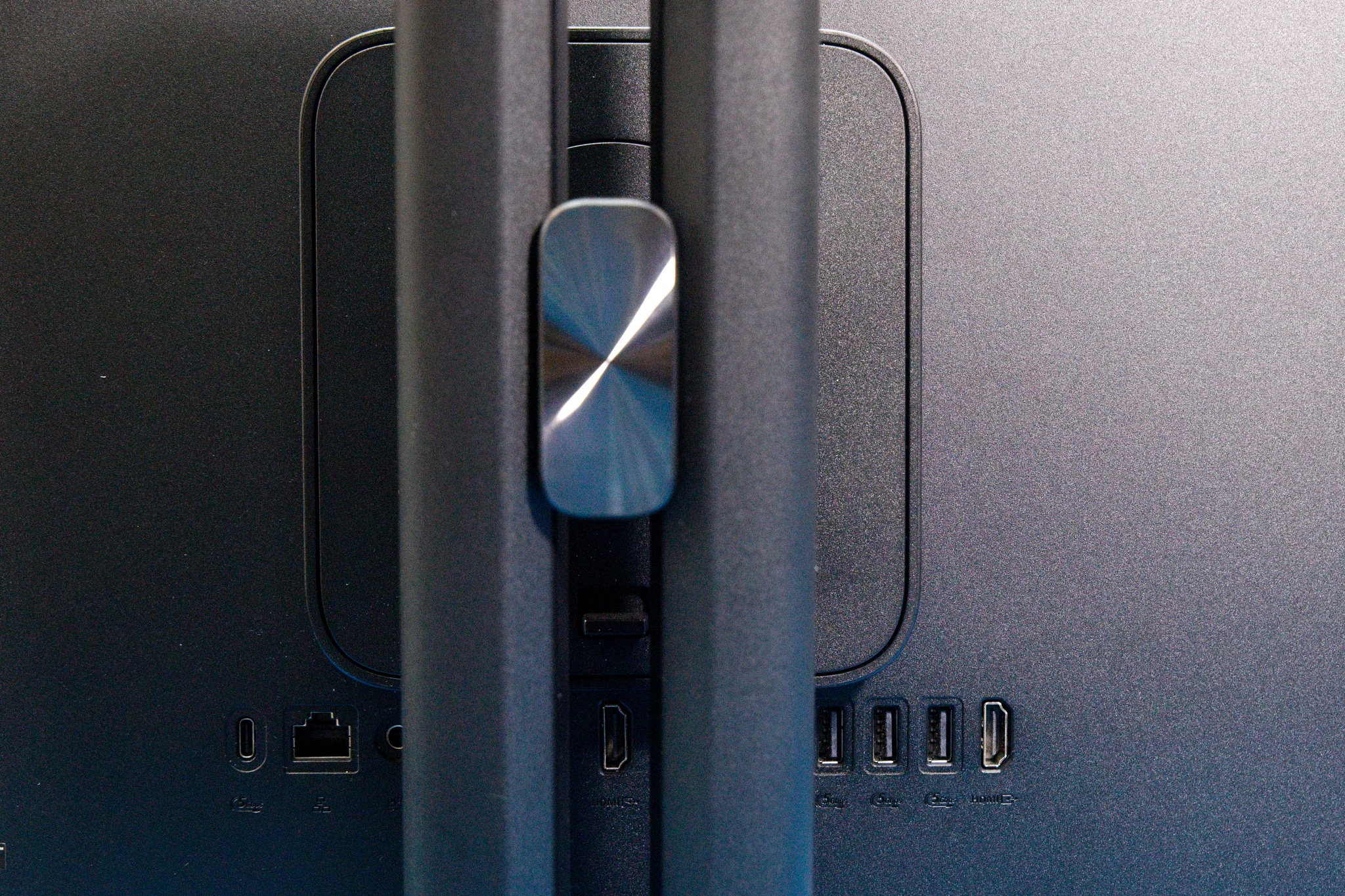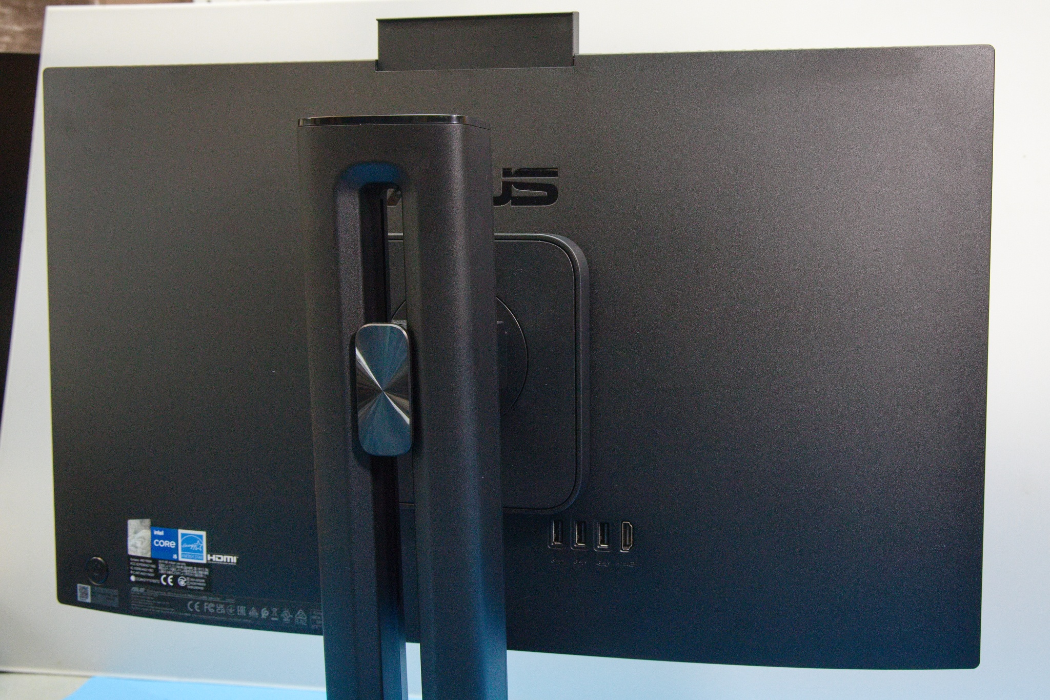 Na spodnej strane vpravo v pohodlnom dosahu používateľa je port USB 2.0 typ-A, kombinovaný 3,5 mm konektor audio jack, tlačidlo Mode na prepnutie režimu HDMI a otvor na zámok Kensington. Na zadnej strane je napájací konektor, konektor RJ-45 pre gigabitový eternet a výstupný port HDMI 1.4 na pripojenie ďalšieho monitora. Je tu aj päť portov USB 3.2 Gen. 1 typu A a jeden port USB 3.2 Gen. 1 typu C. Výrobca pamätal aj na možnosť využitia AiO v úlohe monitora, takže presne v strede je aj vstupný konektor HDMI. Samozrejmosť je Wi-Fi 7 (802.11be), prípadne Wi-Fi 6E (802.11ax) v závislosti od modelu a Bluetooth 5.4.