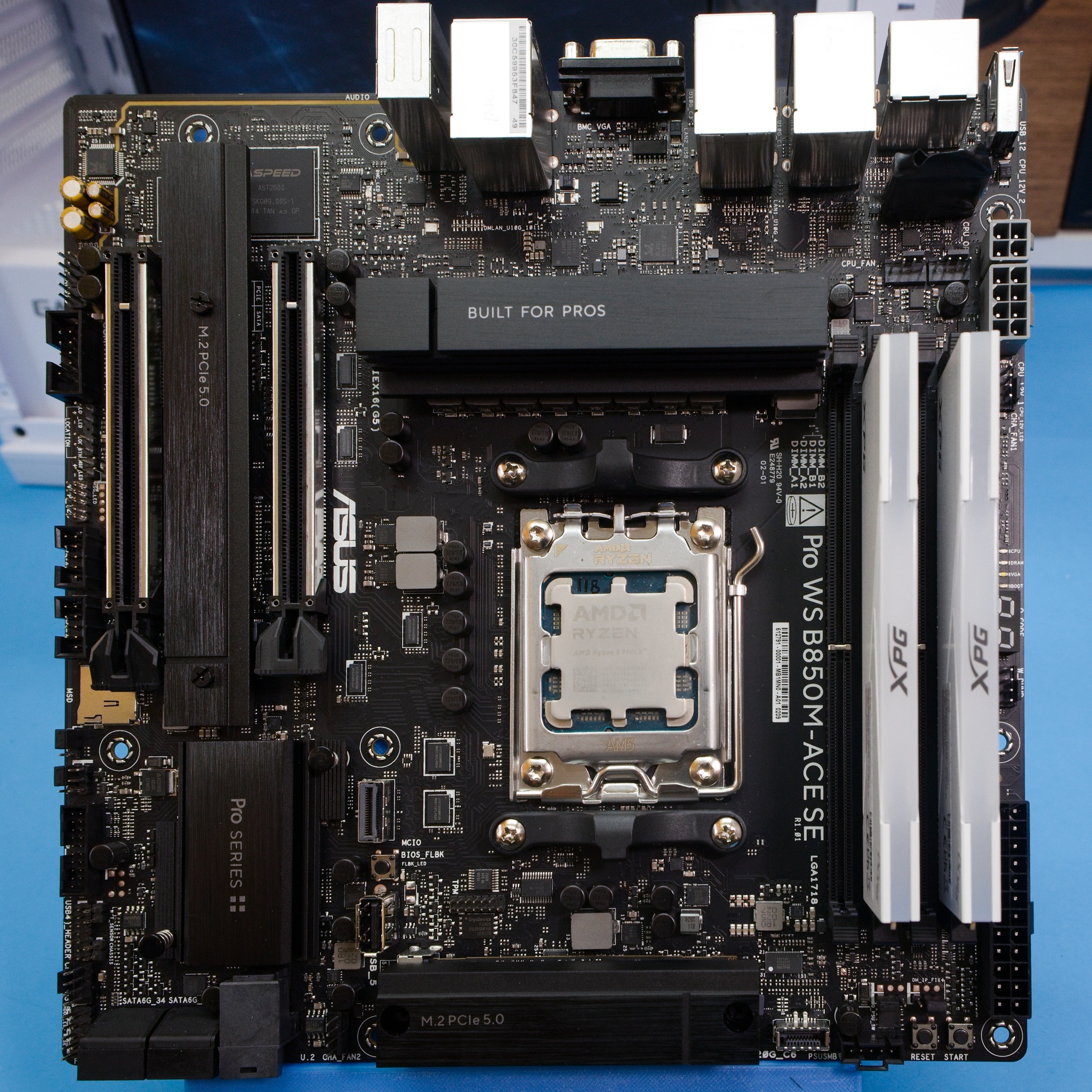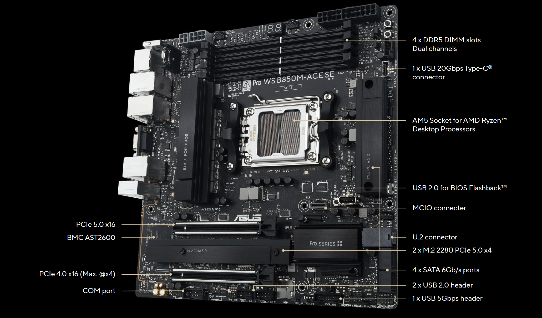 Kľúčové požiadavky pre pracovné stanice sú výkon, stabilita, spoľahlivosť, konektivita a vzdialená správa. Základná doska ASUS Pro WS B850M-ACE SE má konštrukčný formát Micro-ATX. Má päticu AMD AM5, takže je kompatibilná s procesormi AMD Ryzen radu 9000/8000/7000 a AMD EPYC radu 4005. Doska je pripravená pre pokročilé počítače určené na úlohy umelej inteligencie novej generácie s robustným výkonom, ultra rýchlou konektivitou a architektúrou pripravenou na budúcnosť.