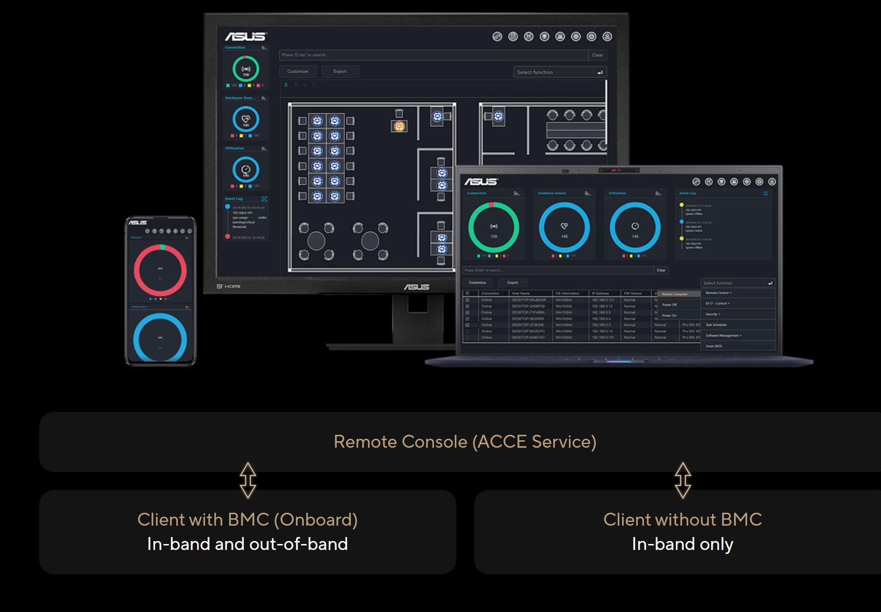 Efektívnu a bezpečnú vzdialenú správu umožňuje čip AST2600 BMC, ktorý využíva protokol IPMI (Intelligent Platform Management Interface Protocol). Na monitorovanie a vzdialenú správu v reálnom čase sa využíva softvér ASUS Control Center Express s vylepšeným zabezpečením a funkciami vzdialeného ovládania, ktoré zabraňujú úniku údajov a zlepšujú prevádzkovú efektivitu IT.