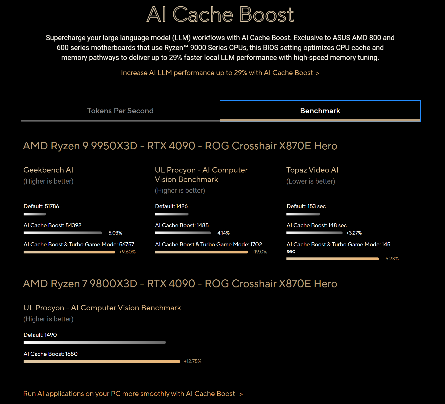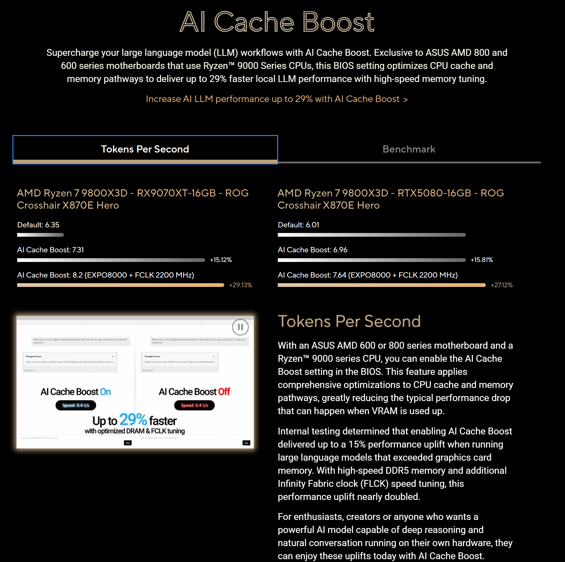 Výkon behu veľkých jazykových modelov (LLM) môžete zvýšiť pomocou AI Cache Boost. Toto nastavenie systému BIOS optimalizuje vyrovnávaciu pamäť CPU a pamäťové cesty, aby sa dosiahol až o 29 % rýchlejší lokálny výkon LLM.