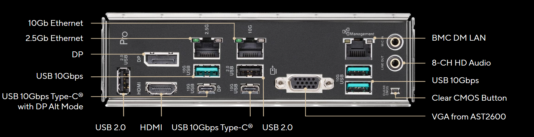 Doska podporuje 20 Gbps USB-C rozhranie. Na zadnom paneli sú tri porty USB-A 10 Gbps, dva porty USB-C 10 Gbps, pričom jeden podporuje režim DisplayPort Alt a dva porty USB-A 2.0. Sú tu aj DisplayPort a HDMI konektor na pripojenie moderných displejov a tiež klasický VGA konektor. Samozrejmosťou sú audio konektory.