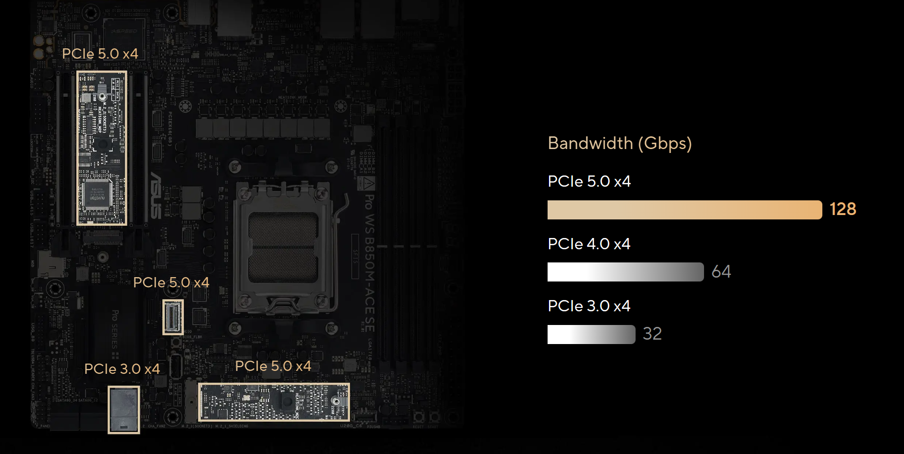 Na doske sú štyri sloty DDR5 UDIMM, ktoré podporujú konfigurácie s ECC aj bez ECC, s overeným pretaktovaním nad 8000 MT/s vďaka rozsiahlej podpore AMD Extended Profiles for Overclocking (EXPO). Môžete tak na maximum využiť potenciál modulov DDR5. Možnosti rozšírenia zahŕňajú slot PCIe 5.0 x16 pripojený priamo k CPU pre grafiku alebo akcelerátory s prenosovou rýchlosťou až 64 GBpsa slot PCIe 4.0 x4 napájaný čipsetom v plnohodnotnom fyzickom slote. Rozteč medzi PCIe slotmi je taký, že keď sa do prvého slotu vloží grafická karta zaberajúce dve pozície, do vedľajšieho slotu PCIe slotu sa síce dá vložiť doska, avšak bude tesne pri grafickej karte, takže v takejto konfigurácii sa dajú použiť len profesionálne grafické karty