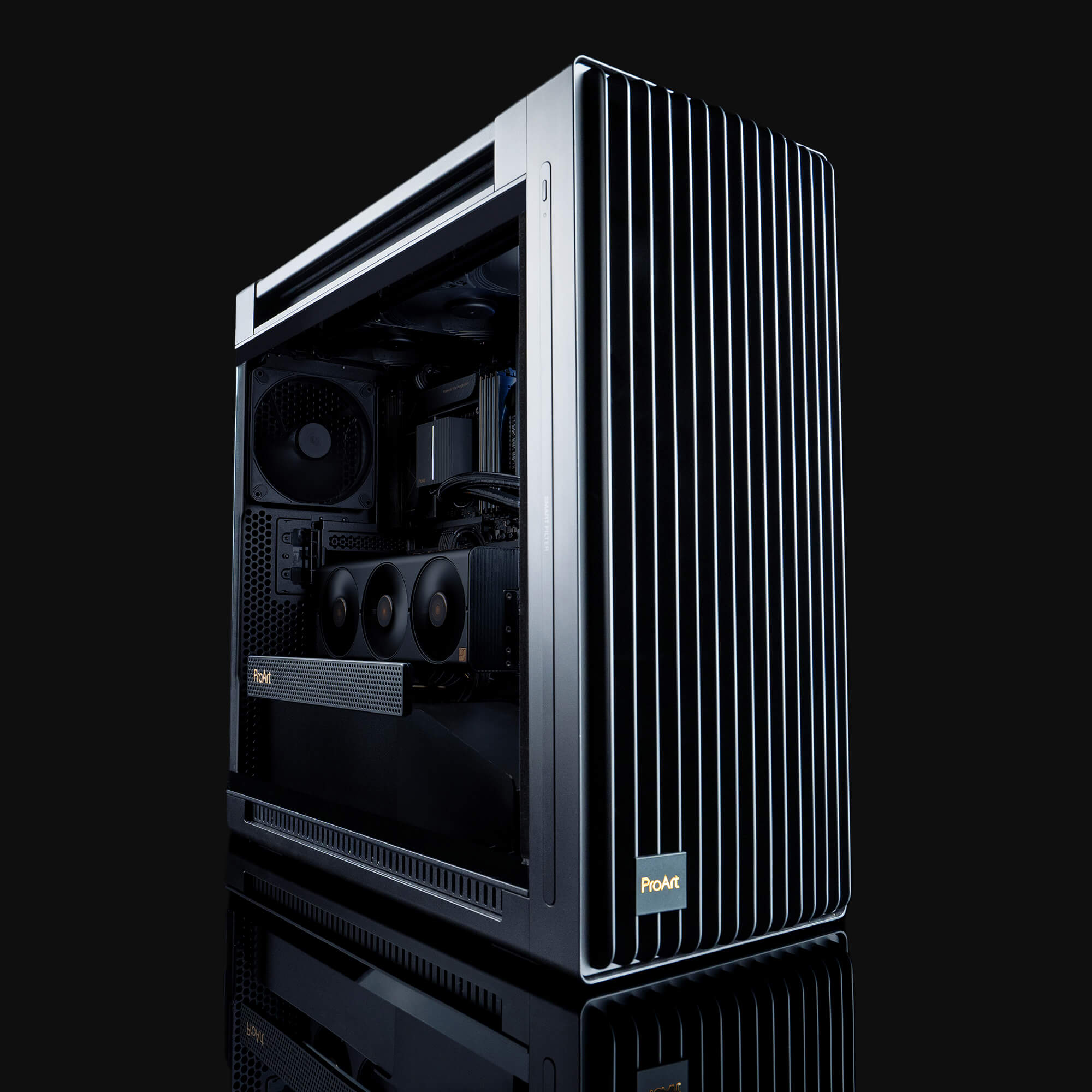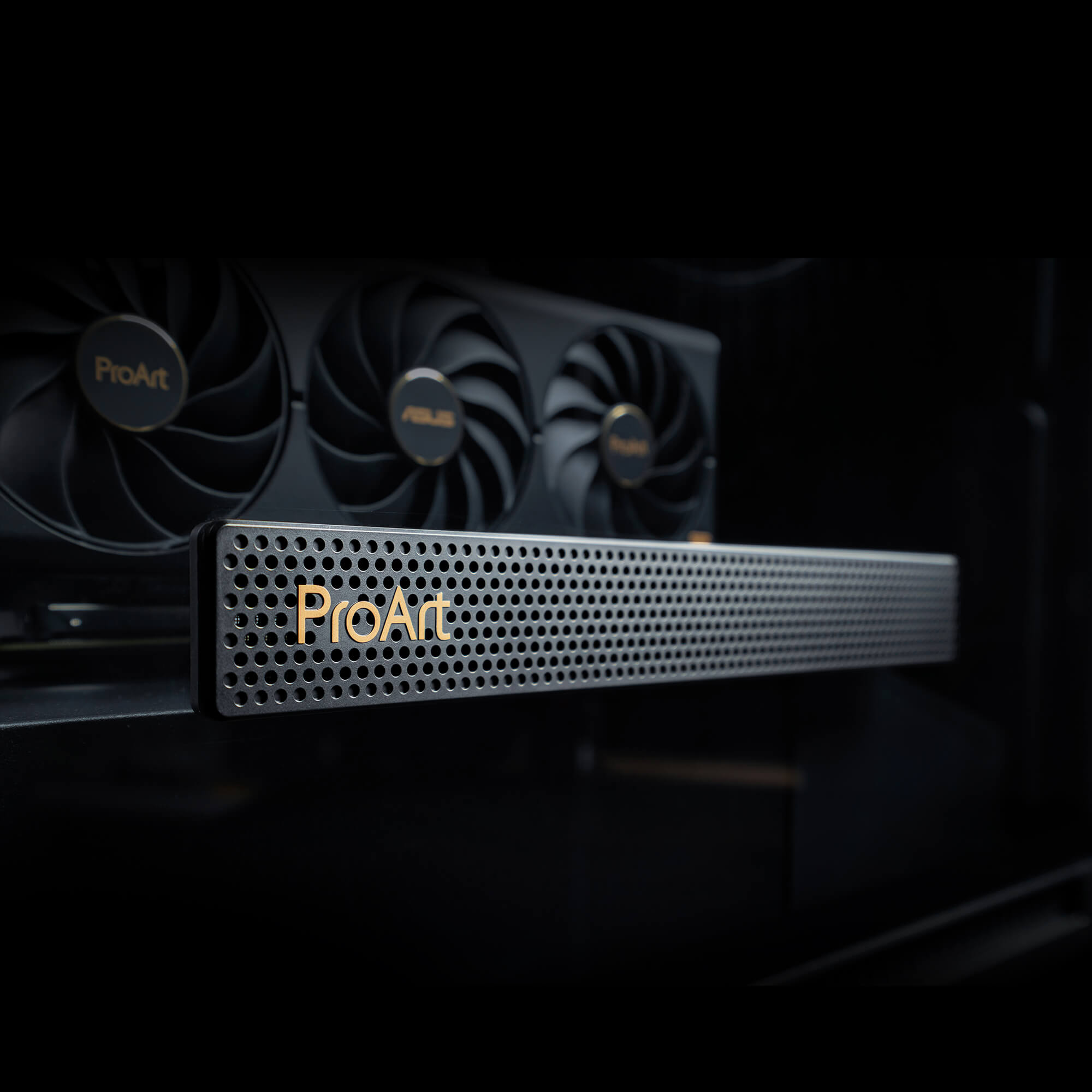 Požiadavky na výkonný hardvér kreatívnych povolaní sa prakticky zhodujú s požiadavkami najnáročnejších hráčov – okrem jednej veci. Profesionálni tvorcovia nepotrebujú, aby im skriňa vrátane ventilátorov blikala všetkými farbami. V skrini ASUS ProArt PA602 nič podobné nenájdete. Je štandardne osadená dvoma obrovskými ventilátormi s priemerom 200 mm vpredu a jedným 140 mm ventilátorom na zadnej stene. Samozrejme, zaujímal som sa aj o prípadnú náhradu 200 mm ventilátorov a pohľad na ponuku e-shopov ma uistil, že s náhradou nebude žiadny problém. Ventilátory majú pri maximálnych otáčkach pomerne vysoký príkon a treba napájať aj IR senzor prachu, preto je rozbočovač káblov pre ventilátory napájaný zo zdroja káblom Serial ATA. Rozbočovač opakuje signál PWM, ktorý mu dodáva štvrtý pin konektora ventilátora základnej dosky. Veľké predné ventilátory majú výhodu v tom, že sú tiché, pretože dokážu vytvoriť dostatočný prúd vzduchu aj pri nízkych otáčkach.