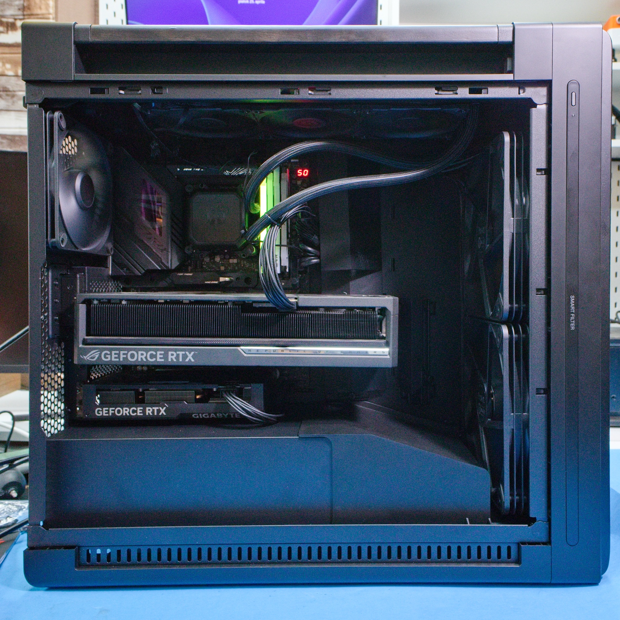 Samozrejme, zaujímala ma účinnosť chladenia, preto som zostave procesora Intel i7 14700K, 80 GB RAM a grafických kariet RTX 5080 a RTX 4060 Ti zadal úlohu na trénovanie neurónových sietí, kde hlavne GPU išli prakticky naplno 45 minút. Skrinka to v pohode zvládla na štandardnom profile chladenie pri veľmi nízkej hlučnosti, v ktorej prevládali tri 120 mm ventilátory vodného chladenia procesora.