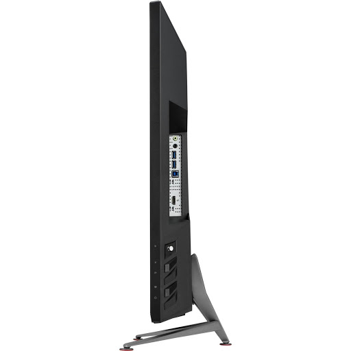 Pri tejto uhlopriečke vám monitor na stole už obsiahne v podstate celé zorné pole, čo je žiaduce práve pri hraní hier. Vzhľadom na jeho veľkosť by však bolo lepšie, keby bol zakrivený. Iba na lepšiu predstavu, oproti 34" ultraširokouhlému monitoru je šírka displeja väčšia o 13 cm a výška o 19 cm, hustota pixelov je podobná ako pri 27" 2K monitore. Pri bežnom používaní poskytuje obrovskú pracovnú plochu, ktorú možno prostredníctvom funkcií PiP a PaP rozdeliť medzi viacero zdrojov signálu. Z dizajnovej stránky je monitor viac podobný televízoru. Rámček je oproti menším modelom hrubší, vzhľadom na veľkosť to však neprekáža. Masívny kovový stojan s trojicou nôh so širokými hrotmi dokáže stabilne udržať monitor, aj keď je tu iba možnosť nastavenia sklonu alebo využitia externého stojana s úchytom VESA. Pri pohľade zozadu upúta obrovské logo ASUS ROG, niekoľko prieduchov a vzorov, ktoré zvyčajne sprevádzajú dizajn monitora ROG. Trocha prekvapivo sa v monitore nenachádzajú žiadne prvky podsvietenia RGB, v škatuli však nájdete projektorové RGB logo Aura Sync ROG, ktoré môžete nainštalovať na zadnú časť, takže bude svietiť pod monitor.