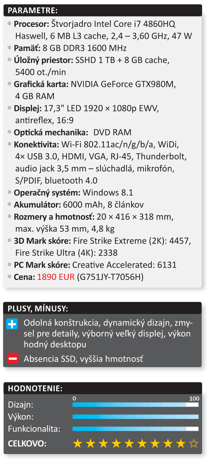 ASUS Republic Of Gamers G751JY je herný notebook, ktorý dokáže nahradiť herný desktop, čo potvrdzujú aj benchmarky. Jeho veľký displej znižuje potrebu väčšej obrazovky a výkon v hrách je úctyhodný. Menšia slabina je hybridný disk, ktorý celý systém mierne spomaľuje a rýchlosťou nedokáže konkurovať modelom s SSD. Páčilo sa nám mohutné konštrukčné vyhotovenie s veľkým zmyslom pre dôležité detaily a kvalitný veľký displej.