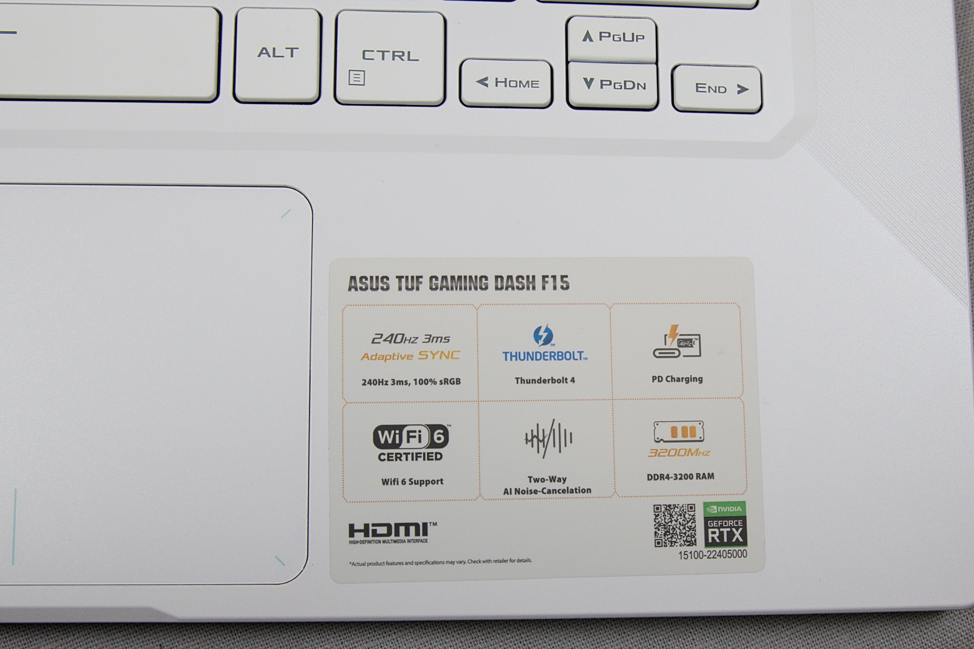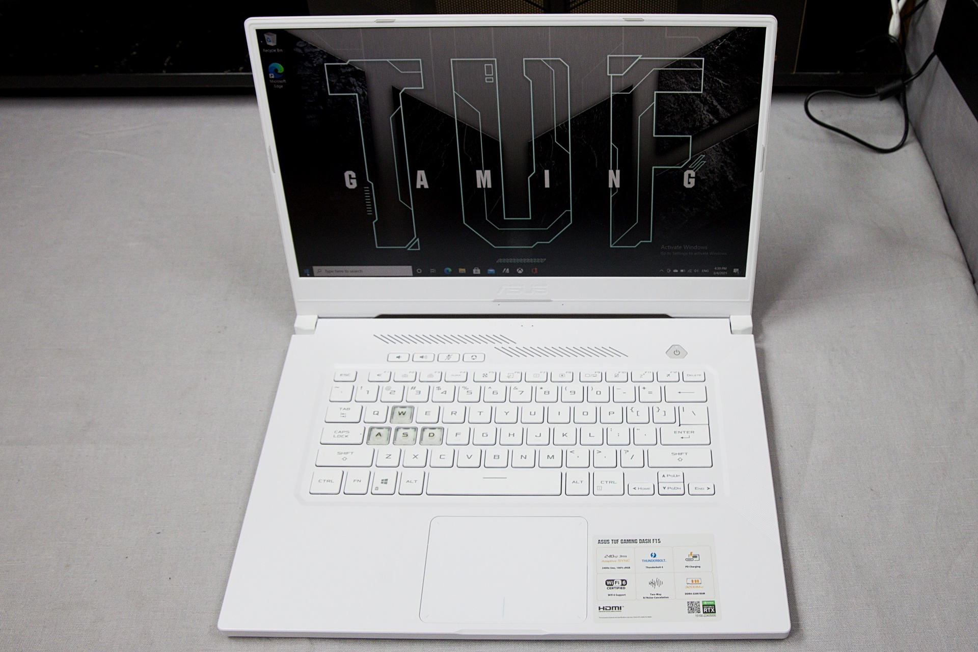 Dizajnéri stavili na elegantný dizajn bez blikajúcich farebných prvkov, ktorý sa niekomu môže zdať konzervatívny. Väčšina používateľov, hlavne študentov a ľudí, ktorí tento počítač budú používať v škole a v práci, však takýto dizajn privíta a ocení aj na herný notebook pomerne malú hrúbku len 2 cm. Krémovo biely povrch variantu Moonlight White je jemne matný a príjemný na dotyk, a ak sa aj ušpiní, dá sa ľahko vyčistiť. Typické rozpoznávacie znaky produktovej rodiny TUF sú veľké logo s elegantným tenkým fontom na kryte displeja, priesvitné „herné“ klávesy WASD a tlačidlo hexagonálneho tvaru na zapnutie/vypnutie. Klávesy WASD sú podsvietené tyrkysovou farbou na celej ploche, takže ľavá ruka ich intuitívne nájde aj v dobre zatemnenom hernom „brlohu“. Ostatné klávesy majú podsvietený obvod a, samozrejme, aj symboly. Klávesnica má klávesy s abecedou a kurzormi štandardných rozmerov, tie v numerickej časti sú trochu užšie, takže sa nehodia na ovládanie hier. Zdvih klávesov je dostatočne dlhý, približne 2 mm, takže ovládanie hier z klávesnice a aj písanie je presné. Pružný odpor klávesov by vzhľadom na to, že ide o herný notebook, mohol byť ešte o niečo silnejší. Touchpad má hladký povrch, takže gestá na ňom sú presné. Spodná stena má vysoké nožičky, ktoré uľahčujú nasávanie chladiaceho vzduchu.