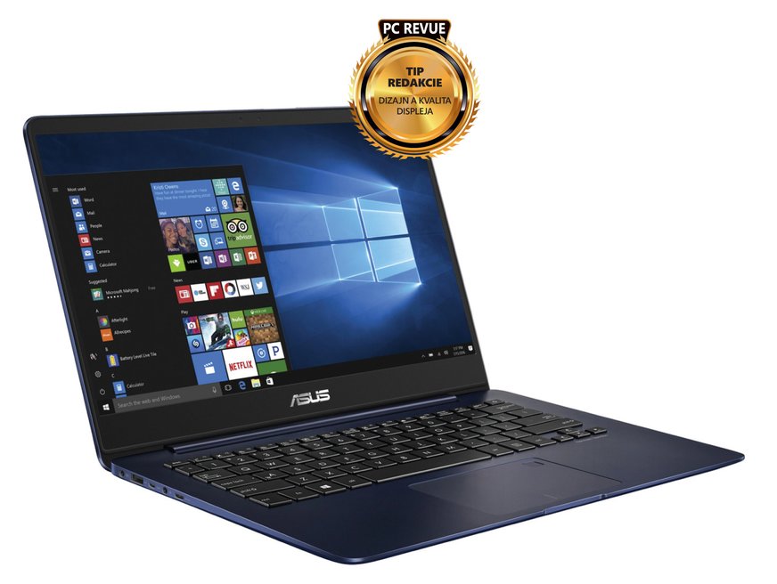 Rozlíšenie full HD je pre operačný systém Windows na 14-palcovom displeji optimálna voľba. Hustota pixelov je síce iba 157 ppi, no na notebook sa pozeráme z väčšej vzdialenosti než na smartfón, takže pixelovú štruktúru obrazu neuvidíte. Technológia IPS je zárukou veľkého rozsahu pozorovacích uhlov bez skreslenia farieb. Vynikajúca je aj rovnomernosť podsvietenia, odchýlka je len 11 %, čo je skutočne špičková hodnota. Ani subjektívnym pozorovaním, ani meraním optickou sondou na osciloskope som ani pri najnižšej úrovni jasu nenameral žiadne kmitanie, takže inžinieri použili inú metódu regulácie než PWM. O vynikajúcej vernosti podania farieb svedčí 100 % pokrytie farebného priestoru sRGB a 77 % pokrytie Adobe RGB, takže grafici a fotografi budú mať svoje výtvory zobrazené skutočne farebne presne. Technológia ASUS Splendid umožňuje nastavenie režimov: štandardný, živý, používateľom definovaný alebo špeciálny režim Eye Care, ktorý znižuje množstvo škodlivého modrého svetla vyžarovaného z obrazovky až o 30 %, chráni oči a znižuje riziko únavy očí pri sledovaní v prítmí alebo potme.