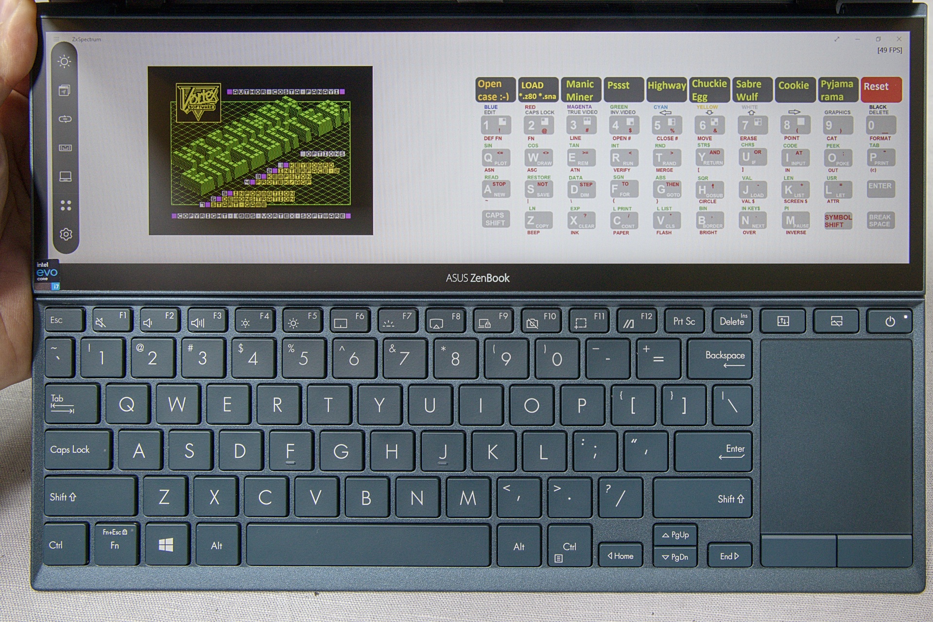 Umiestneniu druhého displeja je do značnej miery podriadená konštrukcia celého prístroja, takže klávesnica je posunutá úplne dopredu a touchpad je úplne vpravo. Inak povedané, predpokladá sa používanie hlavne na stole, kde je ergonómia práce rovnaká, ak nie lepšia ako s bežnou klávesnicou. Klávesnica je samozrejme podsvietená. Klávesy majú dostatočný zdvih 1,4 mm a príjemnú pružnú odozvu, takže písanie je rýchle a presné. Klávesy PgUp, PgDn, Home a End sú alternované na kurzorových šípkach. Na umiestnenie touchpadu vpravo si paradoxne vôbec nemusíte zvykať, je totiž tam, kde by ruka intuitívne hľadala myš. Keďže na rozdiel od obrazovky je orientovaný na výšku, na vodorovný posun kurzora cez viac ako polovicu šírky displeja musieť pri implicitnom nastavení urobiť dve gestá. Musím pochváliť aj výborný zvuk vstavaných reproduktorov, maximálna úroveň hlasitosti ma príjemne prekvapila. Na počúvanie v bežnej miestnosti stačí 70 – 80 % hlasitosť.