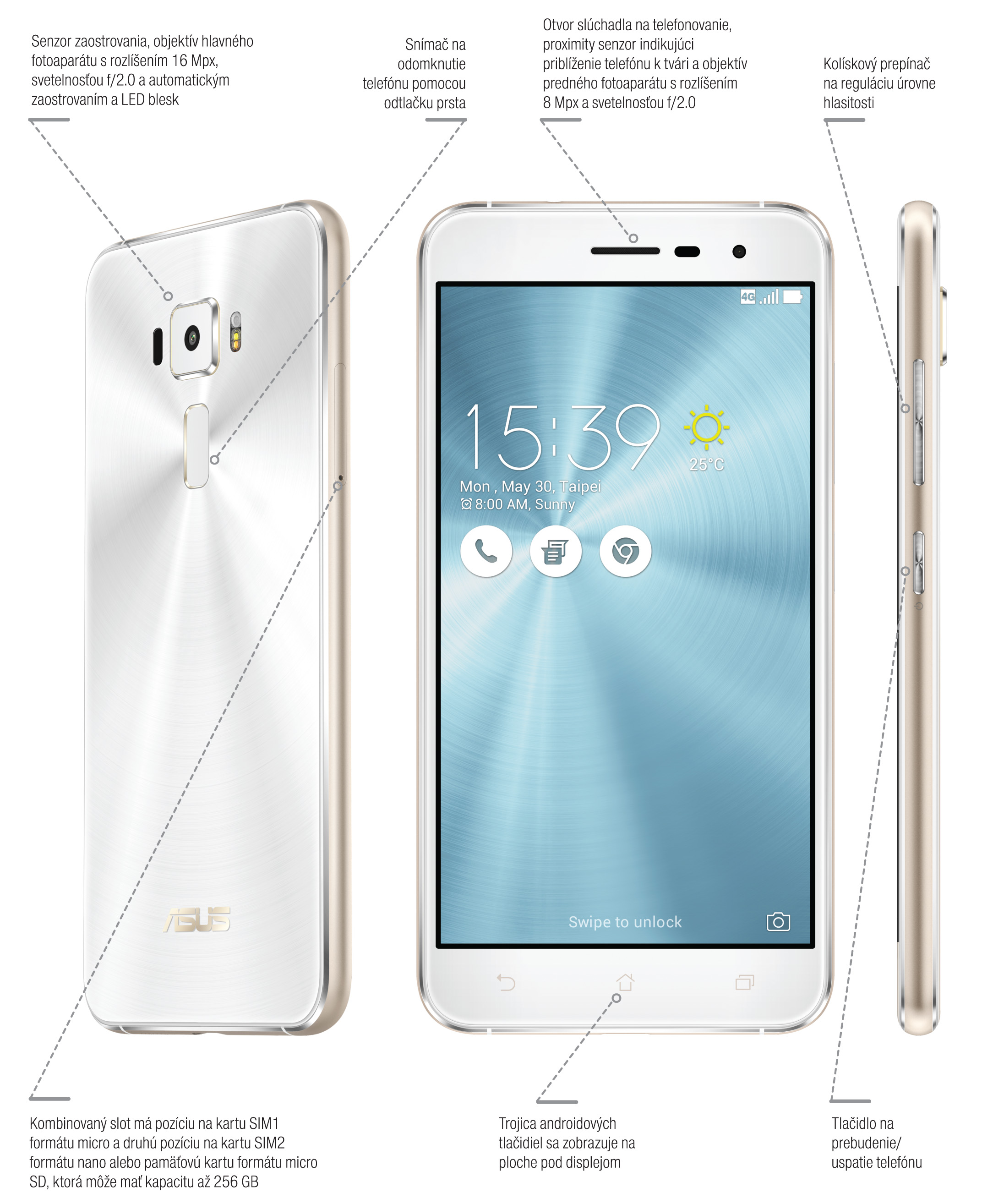 K dispozícii sú dve verzie s rozlíšením full HD, ktoré sa líšia len uhlopriečkou obrazovky 5,2 (ZE520KL), resp. 5,5 palca (ZE552KL). Kombinácia odolného skla Corning Gorilla Glass a kovového rámu navodzuje dojem luxusu a kvality. Sklo je vynikajúci materiál z hľadiska prístupu signálu k anténe aj odolnosti proti poškriabaniu, to všetko za cenu menej spoľahlivého držania. Vyčnievajúce štvorcové teleso fotoaparátu so zaoblenými rohmi však zabezpečí, že telefón sa na mierne šikmej podložke nešmýka. Pod objektívom je snímač odtlačkov prstov, ktorý je podlhovastý a orientovaný na výšku. Funguje spoľahlivo a dostatočne rýchlo, hoci sa zdá, že vývojári možno obetovali nejakú desatinku sekundy v prospech spoľahlivosti. Tlačidlá na pravom boku majú typický asusovský zenový reliéf sústredných kružníc. Telefón podporuje dual SIM, pričom do druhého slotu môžete vložiť buď druhú SIM kartu, alebo pamäťovú kartu microSD. Dátové pripojenie 4G, prípadne 3G zvládne len primárna SIM karta, ale v konfiguračnom menu môžete nastaviť, ktorá zo SIM kariet sa bude považovať za primárnu.