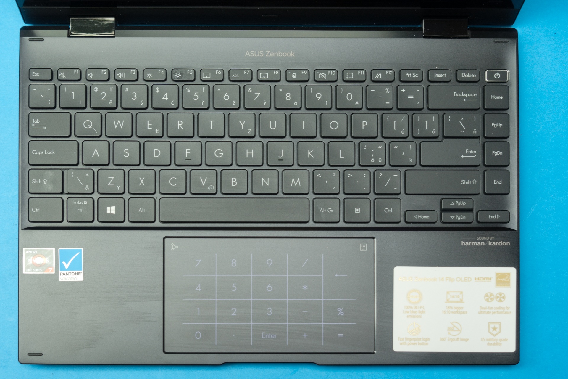 Pre ľudí pracujúcich s tabuľkami, či dokumentmi obsahujúcimi veľa čísel bude dôležitou pridanou hodnotou tohto zariadenia technológia ASUS NumberPad 2.0, čiže možnosť prepnutia touchpadu do režimu numerickej klávesnice. Symboly sú zobrazené s bielym LED podsvietením. Aj v tomto režime fungujú zároveň gestá na pohyb kurzora. Povrch touchpadu je hladký a prsty sa po ňom dobre kĺžu. Konštruktéri počítali s tým, že najčastejšie sa zariadenie bude využívať ako notebook, preto tlačidlo na zapnutie/uspatie s integrovaným snímačom odtlačkov prstov neumiestnili nabok, ale vpravo hore do klávesnice. Snímač umožňuje rýchle a bezpečné prihlasovanie pomocou Windows Hello.