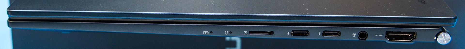 Konštruktérom do pomerne tenkého tela podarilo zabudovať plnohodnotnú výbavu konektorov vrátane HDMI a USB-A portu. Obidva USB-C porty podporujú technológiu Thunderbolt 4 s rozhraním DisplayPort a funkciou Power Delivery. Konektory USB-C na pravej strane sú pomerne blízko pri sebe, takže sirší USB kľúč bude problém zasunúť ak je vo vedľajšom porte kábel. Samozrejmosťou je konektivita podľa štandardu WiFi 6E (2×2, Intel AX211), ktorá poskytne maximálnu dostupnú prenosovú rýchlosť aj v exponovaných priestoroch biznis centier, kde je veľa rôznych WiFi sietí a pripojených zariadení. Bluetooth 5.2 zas umožňuje energeticky efektívnu komunikáciu s pripojenými zariadeniam.