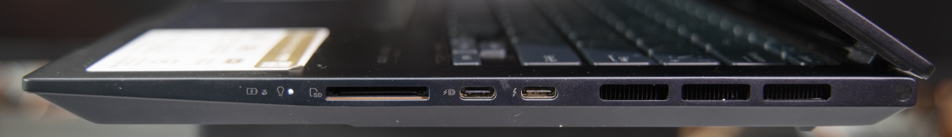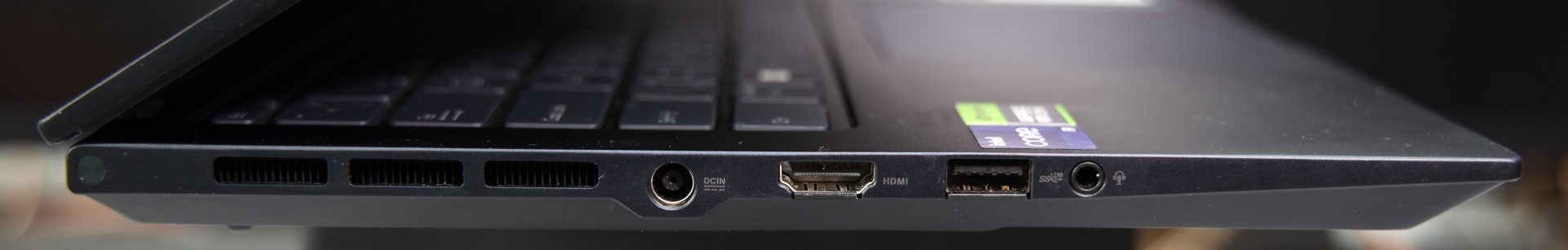 Konštruktérom do pomerne tenkého tela podarilo zabudovať plnohodnotnú výbavu konektorov vrátane HDMI a USB-A portu. Obidva USB-C porty podporujú technológiu Thunderbolt 4 s rozhraním DisplayPort a funkciou Power Delivery. Konektory USB-C na pravej strane sú pomerne blízko pri sebe, takže širší USB kľúč bude problém zasunúť ak je vo vedľajšom porte kábel.