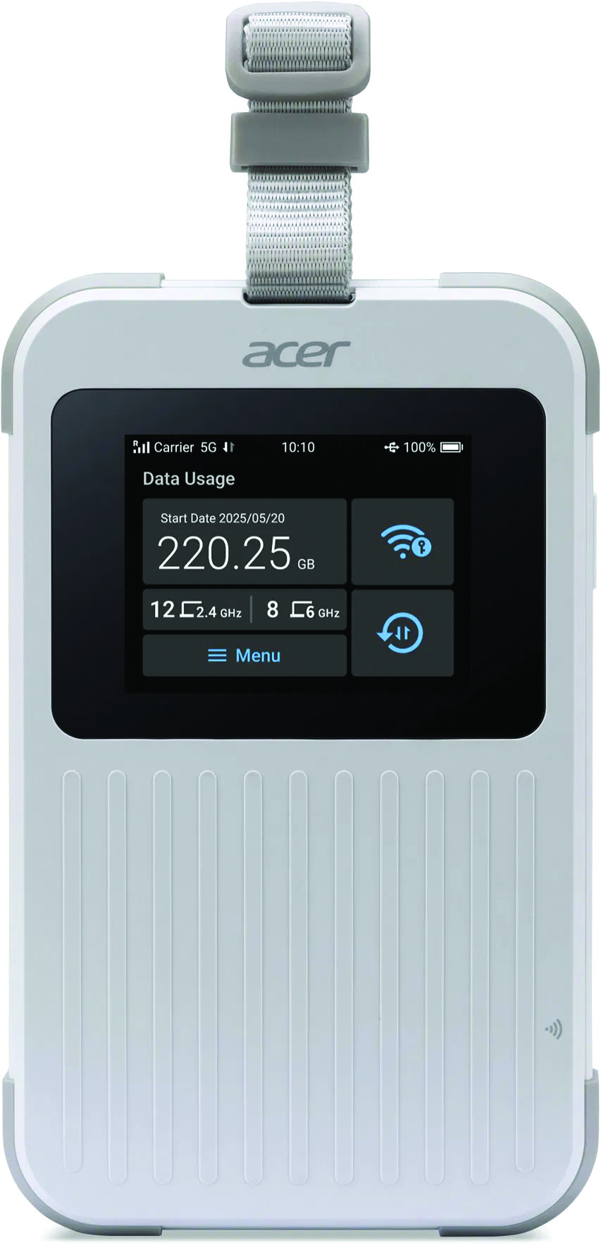 Acer Connect Enduro M6E s rozmermi 140 × 86 × 19 mm a hmotnosťou 295 gramov pripomína skôr powerbank. Vďaka robustnej konštrukcii však plní certifikáciu odolnosti proti prachu a vode na úrovni IP68 a takisto MIL-STD 810H, ktorá zaručuje odolnosť proti extrémnym teplotám, nárazom, pádom a vibráciám, takže nie je problém používať ho aj v exteriéri. Router vytvára hotspot s podporou štandardu až do Wi-Fi 6E a dokáže sa pripojiť k 5G sieťam vo viac ako 140 krajinách sveta. Na domovskej obrazovke sa dá aktivovať funkcia vyhľadávania signálu, ktorá automaticky vyhľadá najsilnejšiu dostupnú mobilnú sieť. Zariadenie podporuje 2×2 MIMO, 6 GHz pásmo a MU-MIMO a výrobca udáva maximálne prenosové rýchlosti až 9,6 Gb/s, aj keď v bežnom používaní ich nemožno dosiahnuť. Bezpečnosť pripojenia zaručuje šifrovanie WPA/WPA2 a WPA3. Okrem toho je k dispozícii funkcia rýchleho pripojenia cez NFC pre smartfóny s Androidom a možnosť zdieľania internetu aj cez kábel USB. Router navyše môže slúžiť aj ako powerbank, ale v nastaveniach pripojeného zariadenia treba upraviť, aby nenabíjalo router, ale naopak.