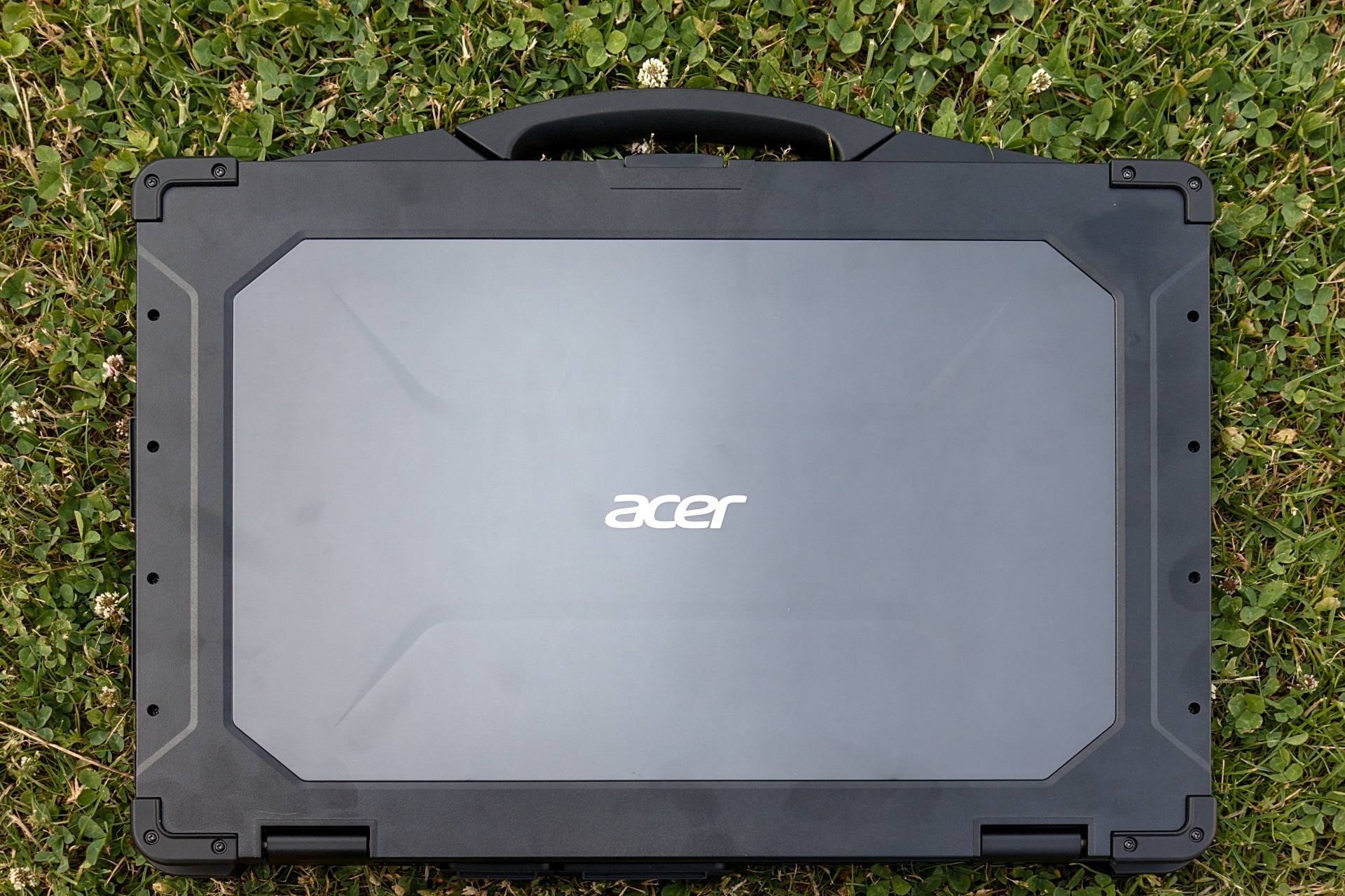 Sprievodným znakom letných horúčav je však aj občasná búrka s prudkým lejakom a tak som mohol nechtiac otestovať, že Acer Enduro N7 bez problémov funguje aj počas prudkého lejaku. Ak som predtým nemal úplne jasno v tom, čo v špecifikácii IP65 znamená odolnosť proti tryskajúcej vode, po prudkom lejaku som to vedel úplne presne. Taktiež som ocenil schopnosť zodolneného notebooku fungovať v extrémnych horúčavách. Západka pod vysúvateľnou rukoväťou drží displej v zatvorenej polohe. Vyskúšal som, že ani po páde z metrovej výšky do trávy sa notebook neotvorí. To bol úmyselný test, avšak priznám sa že raz mi notebook spadol na trávnik otvorený a aj tento pád prečkal bez akejkoľvek úhony. Vyskúšal som aj prácu v rukaviciach a pomerne vysoký zdvih kláves umožňuje presné, aj keď nie rýchle písanie, čo oceníte napríklad pri ručnom zadávaní nameraných hodnôt. Snímač odtlačkov nemá problému ani s mierne ušpinený prstom. Veľmi praktický je programovateľný kláves umiestnený vpravo hore vedľa vypínača, používal som ho na spustenie aplikácie, ktorú som najčastejšie používal. Ako je u zodolnených notebookov zvykom touchpad je pevný, takže sú pod ním dva mechanické tlačidlá. Napriek malým rozmerom je presný a pomerne citlivý.
