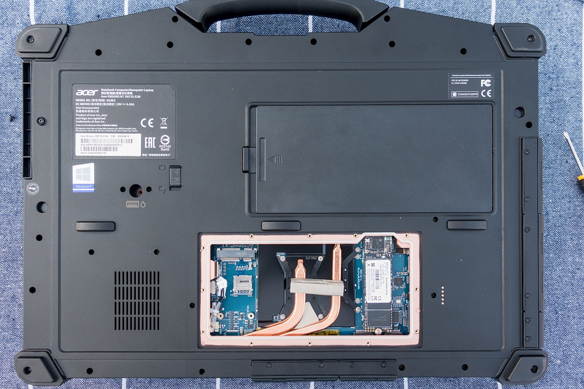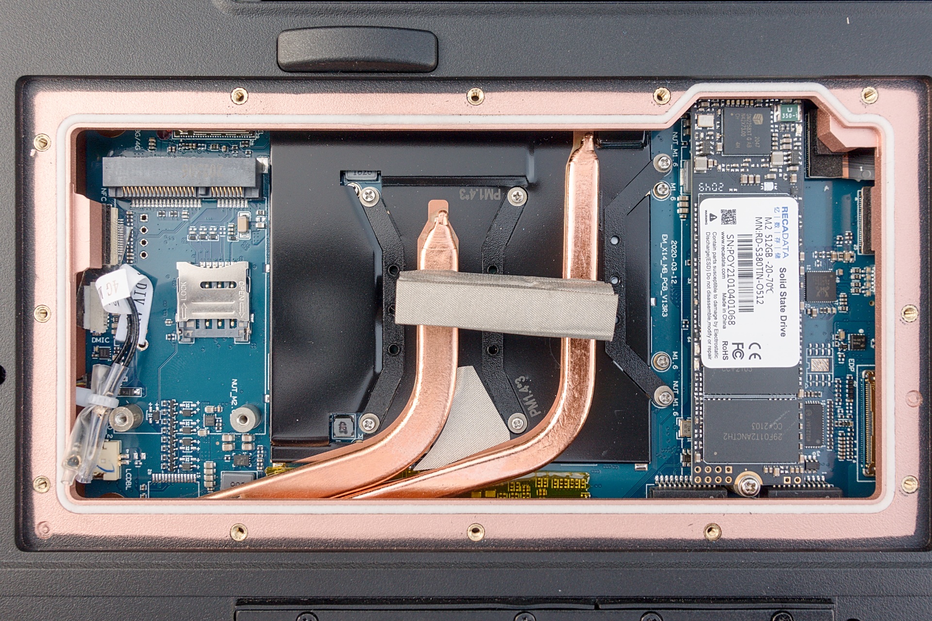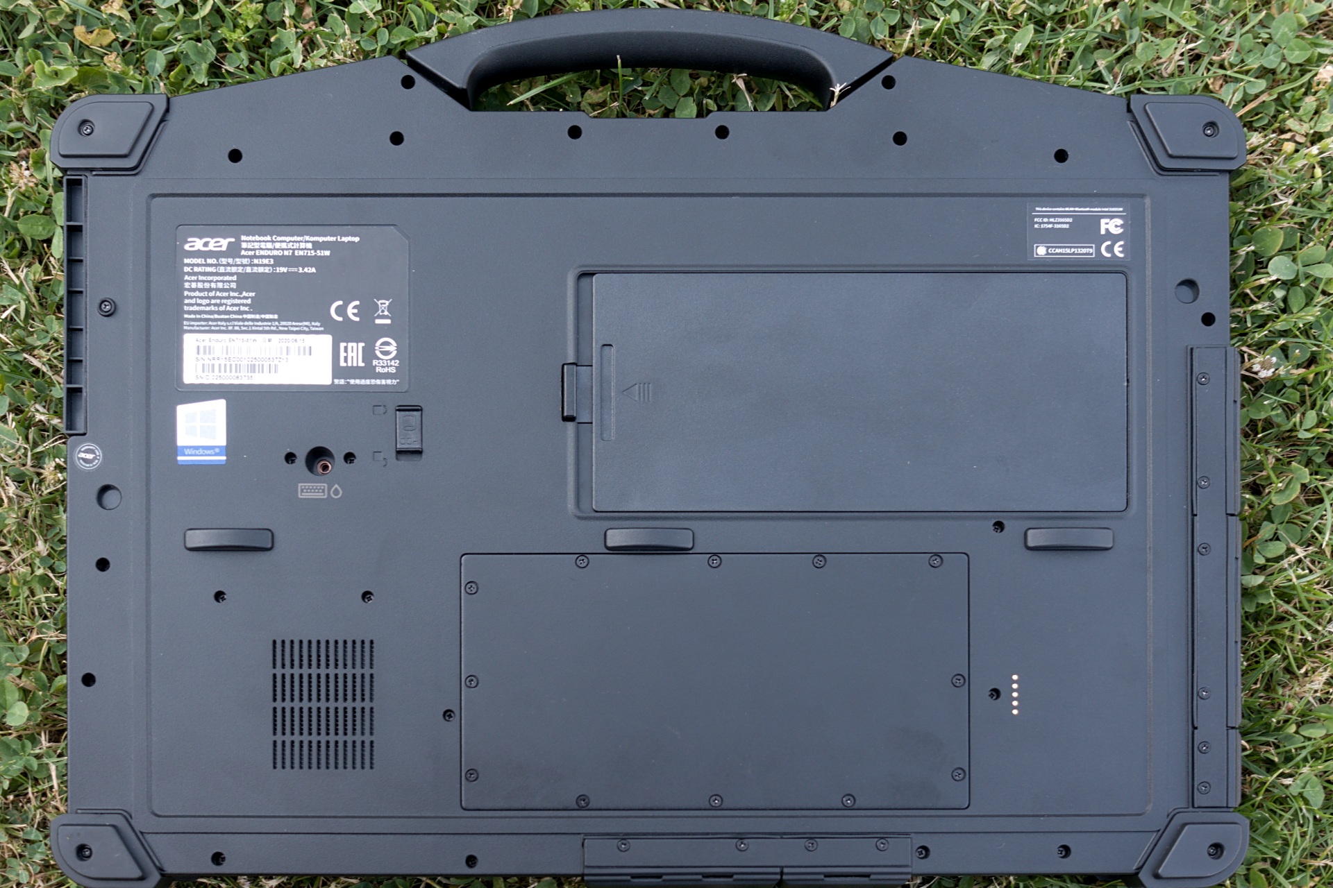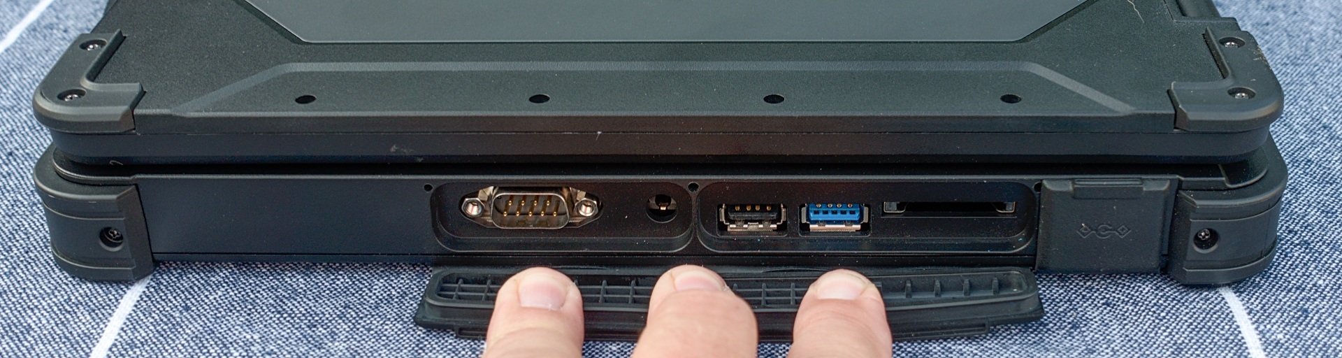 Používateľ má na ľavej strane k dispozícii aj slot na 2,5“ disk, ktorý sa dá vysunúť po uvoľnení poistky na spodnej strane. Na spodnej strane je aj odvodňovací otvor klávesnice a otvor pre ventilátor, ktorý je samozrejme skonštruovaný z ohľadom na vodeodolnosť. Po uvoľnení príslušnej západky môžete vybrať batériu. Notebook umožňuje hot-swap výmenu batérie, čo umožňuje jeho nepretržité používanie. Jedna batéria je vstavaná a druhú môžete počas používania vymeniť. Pri vyberaní slotu s diskom, prípadne batérie musíte použiť väčšiu silu, pretože je potrebné prekonať pružný odpor tesnení. Na spodnej strane je tiež samostatný kryt na prístup SSD disku. Pod krytom testovacieho prístroja bol aj slot na GSM dátový modul Pri výmene dôrazne odporúčam použiť originálne komponenty.