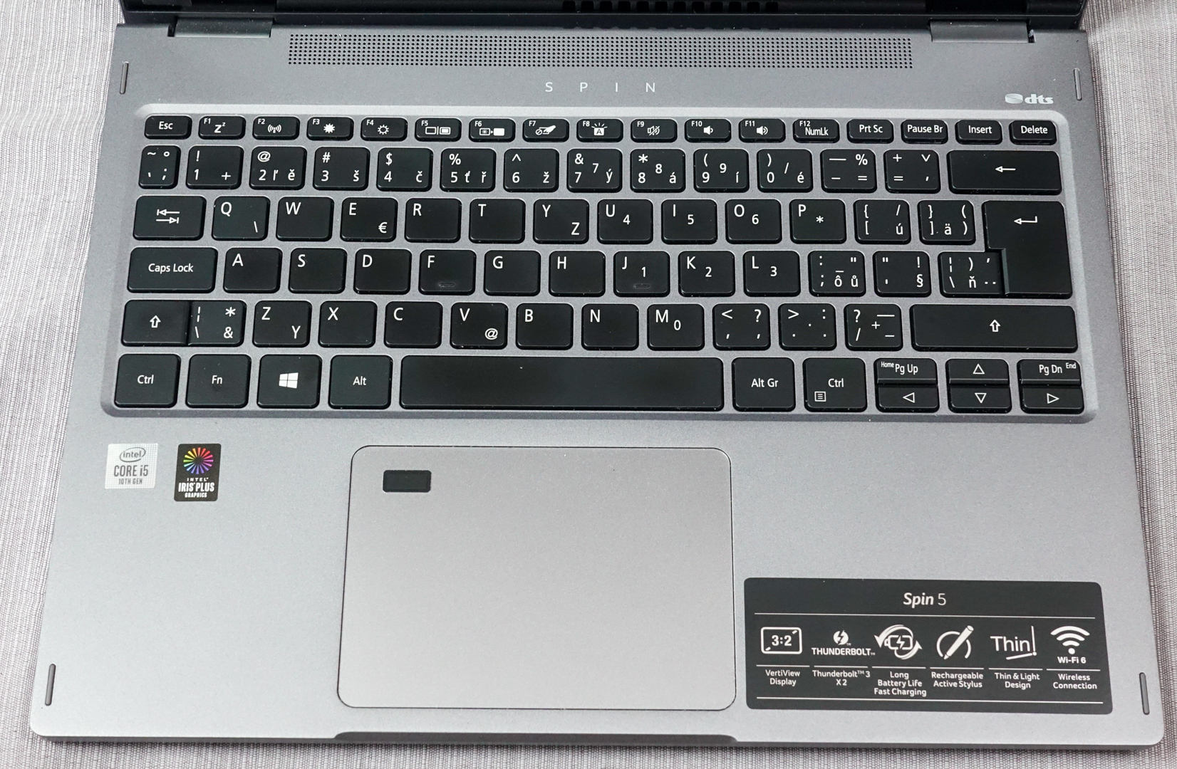 Inovovaný Spin 5 poznáte od staršej verzie hlavne podľa displeja s veľmi praktickým pomerom strán 3:2, tela zo zliatiny hliníka a horčíka, pričom je aj poznateľne tenší. Kovová konštrukcia s na dotyk príjemnou povrchovou úpravou zaručuje dostatočnú pevnosť a robustnosť aj pri pomerne malej hrúbke. Displej má pomerne široký spodný rámik, no je to pravdepodobne kvôli tomu, aby ste ho mohli po preklopení displeja o 360° v režime tablet a orientácii na výšku pohodlne držať. Aj pri orientácii na výšku sa naplno prejaví výhoda pomeru strán displeja 3:2, ktorý je vynikajúci napríklad na čítanie e-kníh a samozrejme ja prácu s dokumentmi či už v režime na šírku, alebo na výšku. Naproti tomu formát 16:9 u prechádzajúcej generácie Spin 5, či konkurenčných konvertibilných zariadeniach síce exceluje pri prehrávaní videí, avšak v režime tablet na výšku som pri čítaní e-kníh, napriek tomu, že sa na stránku zmestilo viac textu mal dojem, že čítam nejaký leták, či jedálny lístok. Dotykový IPS displej má lesklú povrchovú úpravu a dostatočne široké pozorovacie uhly bez pozorovateľného skreslenia farieb. Rozlíšenie 2256 x 1504 pixelov je pri uhlopriečke 13.5" tak akurát, takže subjektívny dojem zo zobrazenia a to aj počas letného slnečného dňa je veľmi dobrý.