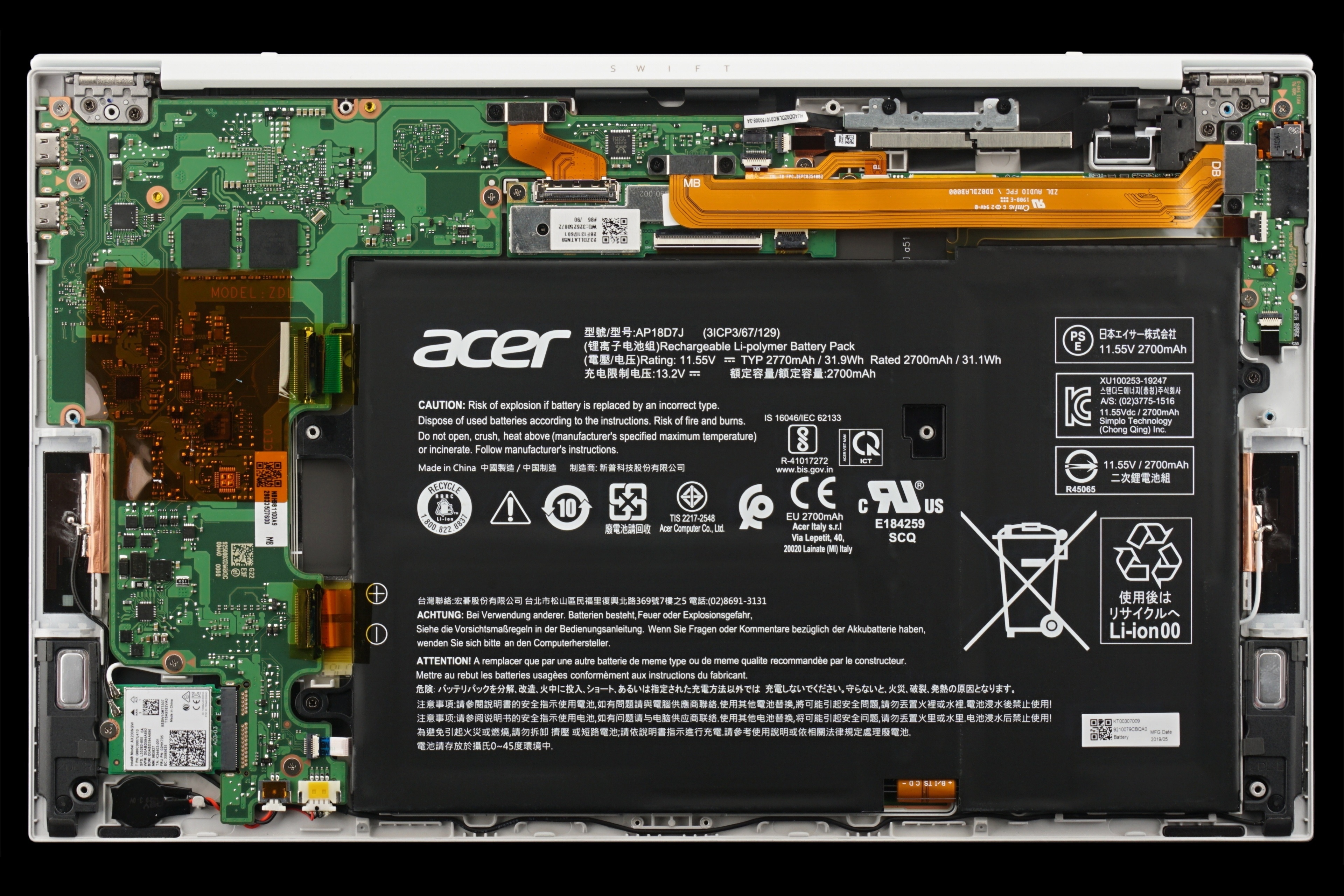 Snaha o miniaturizáciu by bola trochu zbytočná, keby jej nezodpovedala poriadna výdrž, ktorá je na cestách mimoriadne dôležitá. A 17 hodín v kancelárskom prostredí (pri polovičnom jase s Wi-Fi na webe) je veľmi slušný výsledok. Viac ako päť hodín zvládne 2700 mAh batéria i v záťaži. K tomu však treba dodať a zdôrazniť, že nie je Core i7 ako Core i7. Táto superúsporná Ci7-8500Y (2 jadrá/4 vlákna) je výrazne slabšia ako Core i3-8145U a len o málinko výkonnejšia ako Core i3-7100U, zato je podstatne efektívnejšia a má tretinovú spotrebu. V plnej záťaži s jasom displeja na 100 % príkon takto vybaveného Swift 7 zodpovedá iba 15 W. Preto interiér ani neobsahuje ventilátor a na chladenie stačí medený blok. Zahrievanie CPU nepresiahne 70 °C a frekvencia pri mnohovláknovej záťaži neklesne pod 1,8 GHz, čo je stále 300 MHz nad špecifikáciami Intelu pre base clock. Niekto sa možno pozastaví nad jemným bzučaním cievok (i mimo záťaže), ktoré je trochu otravné najmä v noci, takže bezhlučný chod si i napriek pasívnemu chladeniu neužijete.