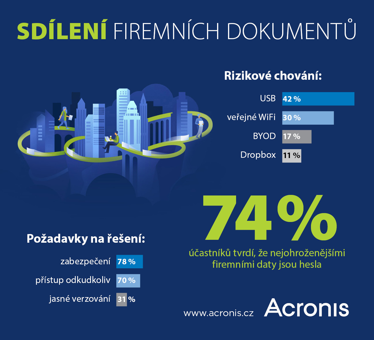 Acronis, celosvetový líder v oblasti kybernetickej ochrany, uviedol, že podľa lokálneho prieskumu, ktorý sa uskutočnil medzi účastníkmi konferencií Acronis Roadshow v Prahe, Ostrave a Bratislave považuje najviac organizácií (42 %) za najrizikovejší spôsob zdieľania dokumentov ich ukladanie a zdieľanie na USB pamäti. K ďalším aktivitám, ktoré ohrozujú firemné dáta, sa radí využívanie verejných WiFi sietí, prístup z BYOD zariadení a ukladanie do verejných úložísk typu Dropbox.