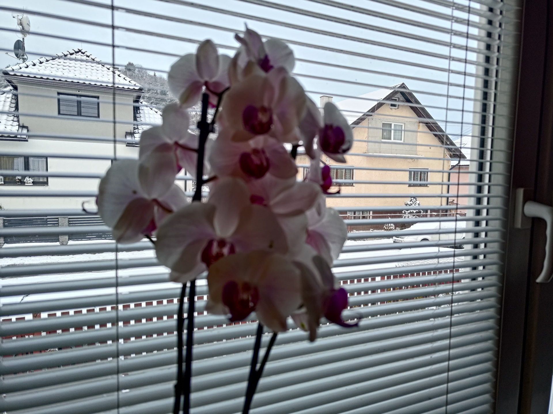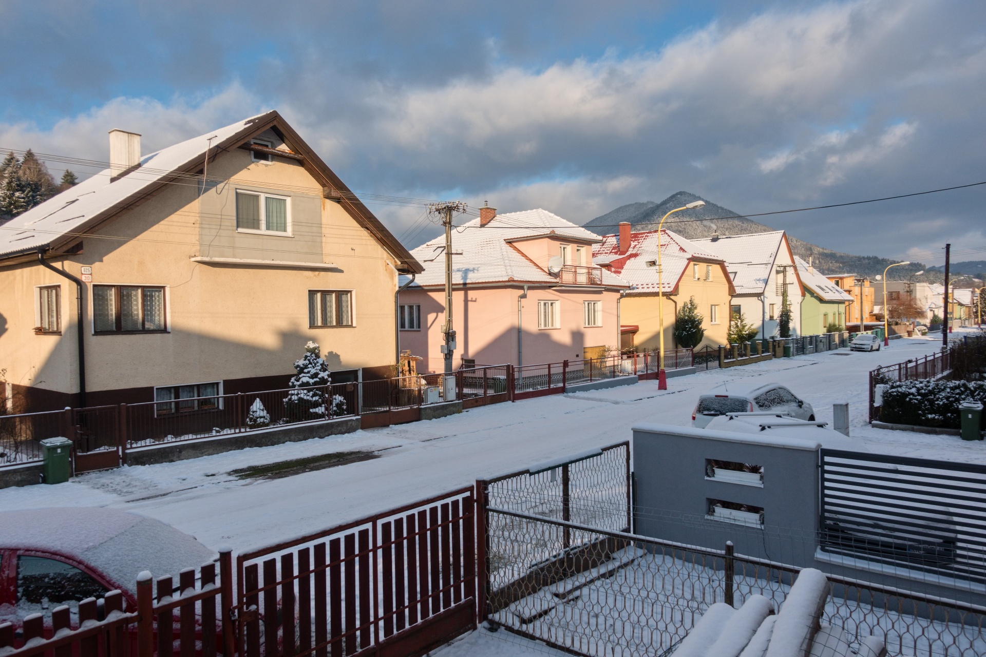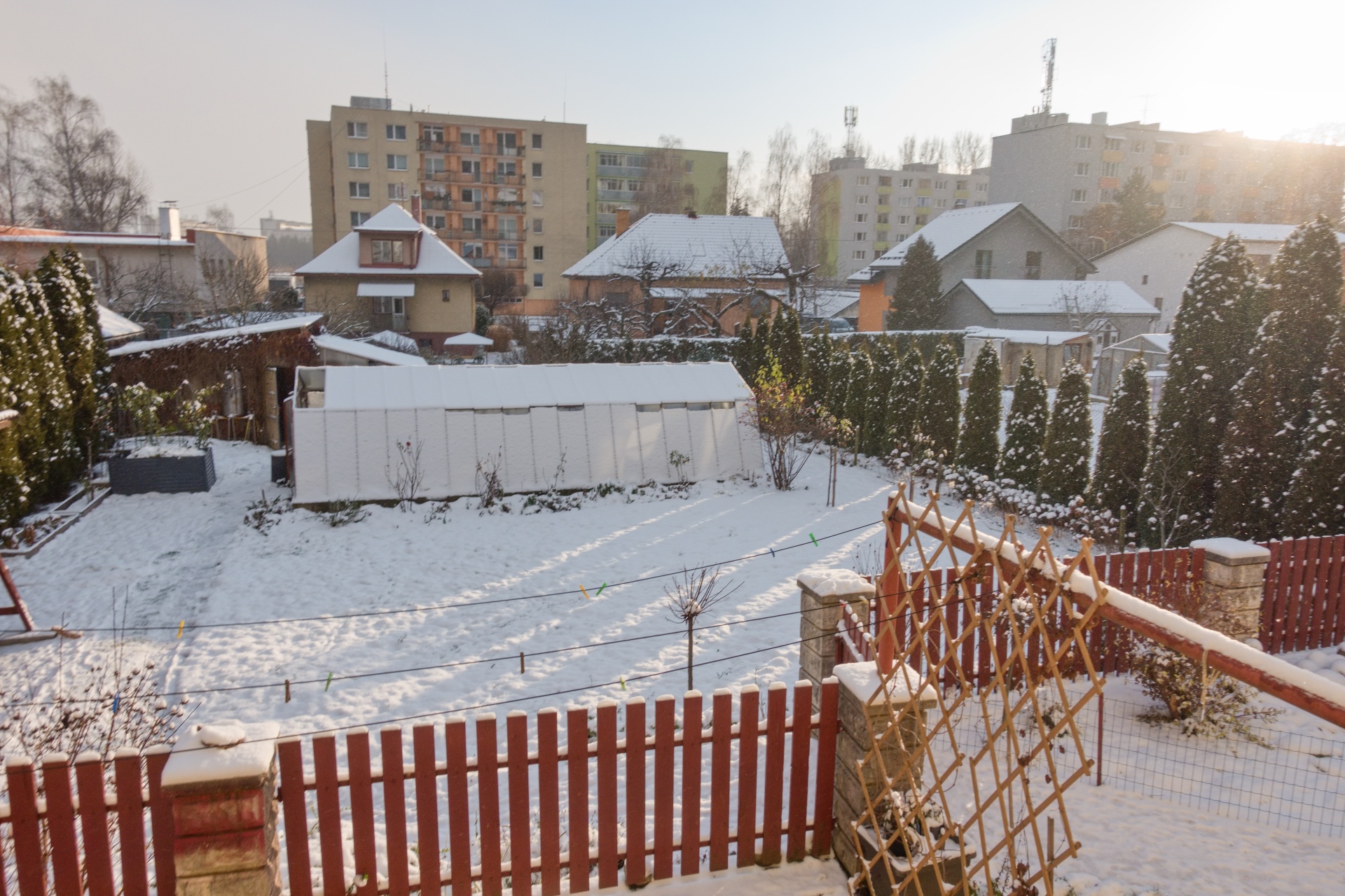 Fotoaparát správne nastaví parametre expozície aj pri takýchto záberoch, kde je objekt v popredí osvetlený podstatne menej ako pozadie. Vľavo je zaostrené na kvet v popredí, vpravo na domy na ulici. Zaostrovacia automatika za nedala oklamať ani žalúziami.