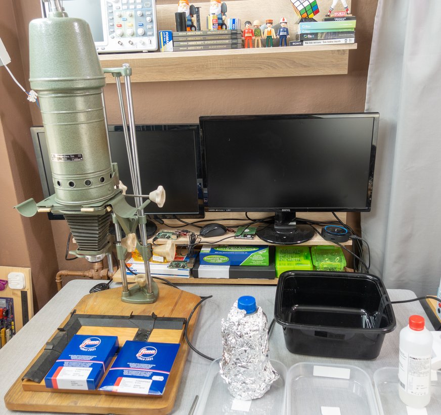 Keď sme publikovali článok a video o fotení dierkovu komorou (camera obscura), netušili sme že pre mladých ľudí, ktorí poznajú len digitálnu fotografiu to bude až také retro. Ani nie princíp dierkovej komory, o tom sa v škole učia, ale postup ako sa fotí na čiernobiely celuloidový film, ako sa taký film vyvolá a ako sa z neho zhotovia fotografie. Prvá časť postupu, čiže vyvolanie filmu je v článku takže do skompletovania celého postupu vytvorenia klasickej fotografie zostáva posledná časť procesu – zväčšovanie a vyvolanie fotografií.
