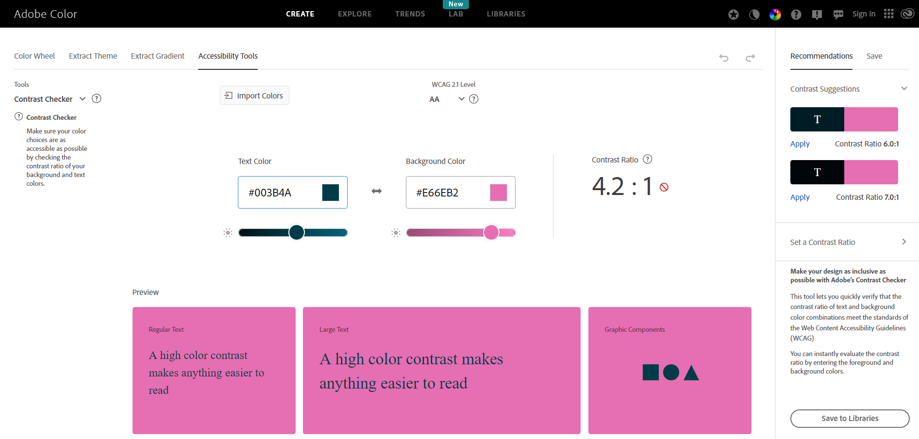 Nech už dáte prednosť akejkoľvek farebnej palete, hlavne v prípade webového návrhu nezabúdajte použiť dostupný nástroj na kontrolu uľahčenia prístupu. Umožní vám skontrolovať vašu paletu z hľadiska kontrastu s písmom, čo je veľmi dôležité pri ľuďoch s horším zrakom a takisto v súvislosti s najčastejšími druhmi farbosleposti.