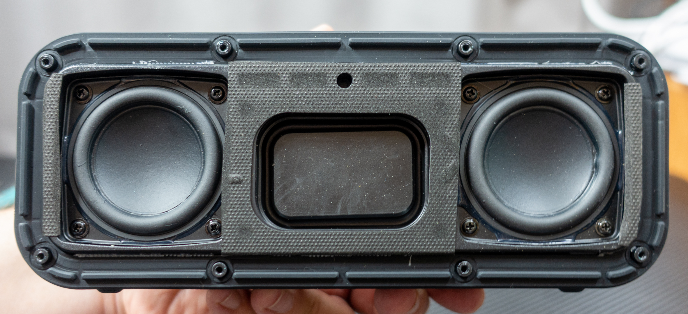 Telo tohoto outdoor reproduktora pôsobí serióznym a robustným dojmom, ktorý podčiarkujú skrutky, ktorými je upevnené predné a zadné čelo a klipsa na pravom boku, ktorá umožňuje zavesenie reproduktora, či jeho prenášanie za opaskom. Reproduktor je vodotesný s deklarovaným stupňom odolnosti IP67, takže ponorný do hĺbky 1 m by mal vydržať 30 minút. V praxi to znamená, že môže byť aj pomerne dlho na daždi a náhodný pád do vody by mal prečkať bez úhony.
