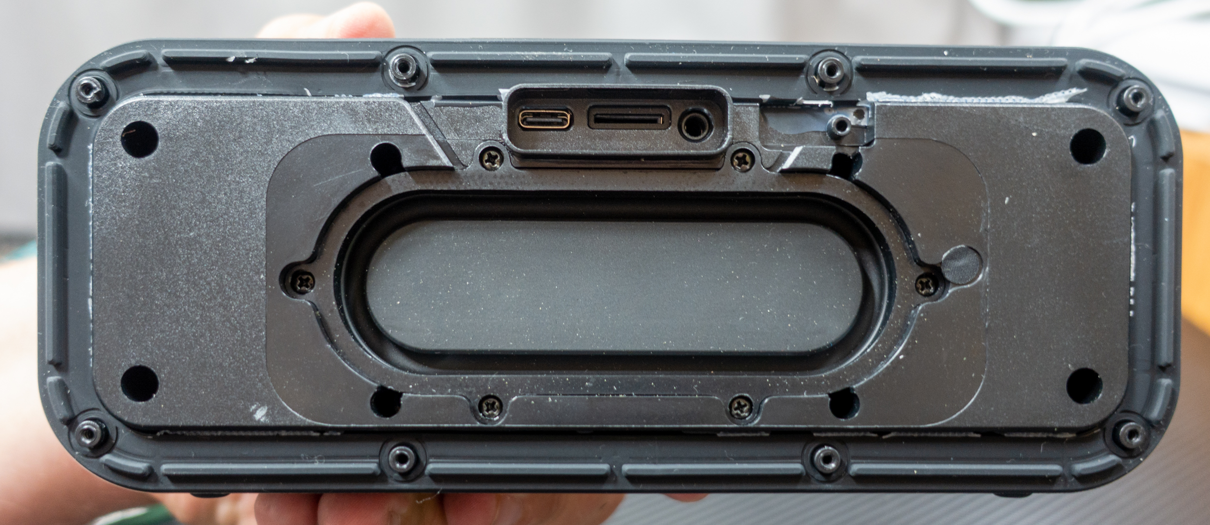 Pod utesneným krytom okrem konektorov USB-C a 2.5 mm audio Jack nájdete aj slot na pamäťovú microSD kartu. Akustické meniče s priemerom 58 mm sú doplnené pasívnym žiaričom vpredu