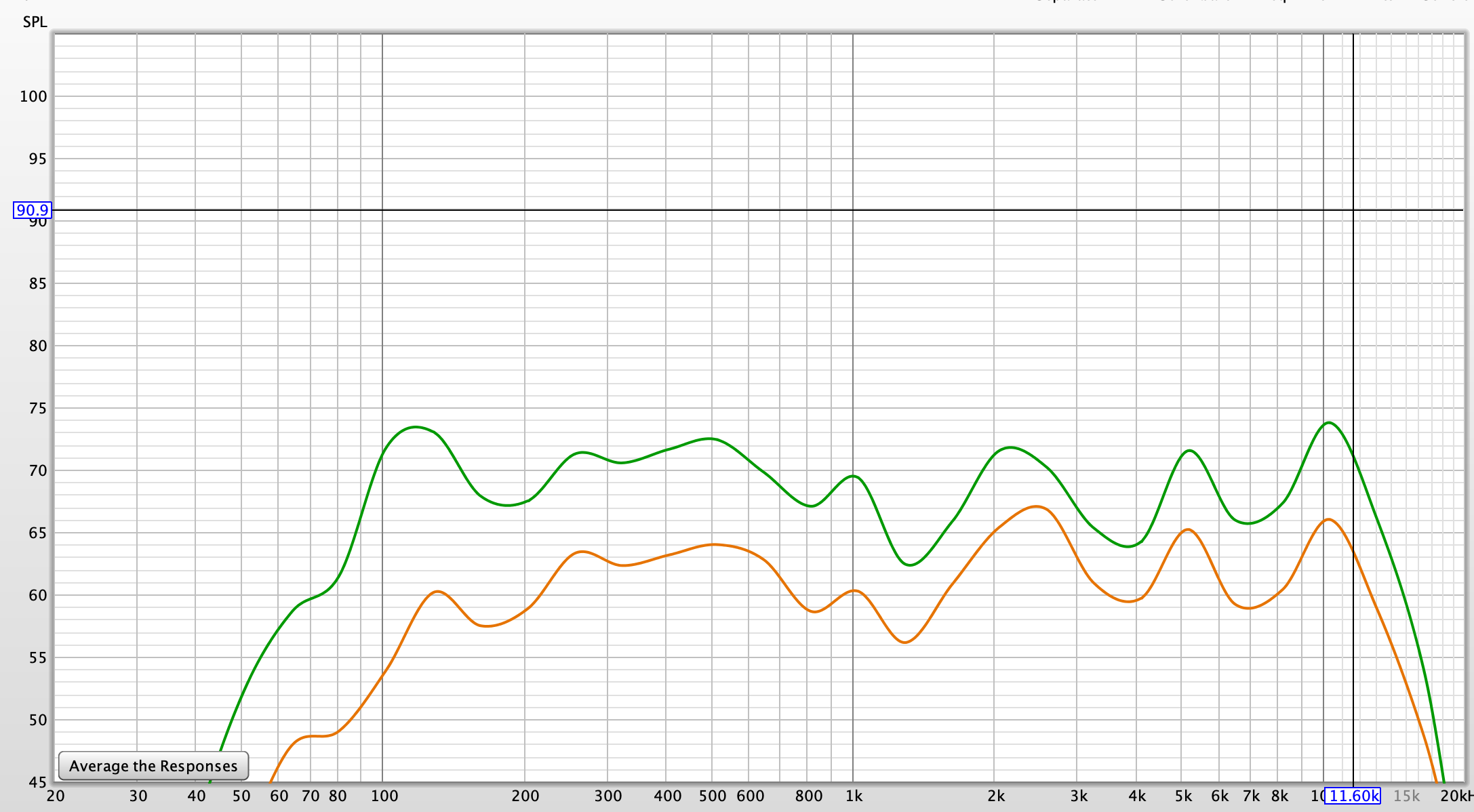 Porovnanie akustického tlaku v dB (SPL) pri rovnakej hlasitosti. Oranžová krivka je pri vypnutej a zelená pri zapnutej funkcii Super Bass.