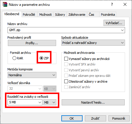 Nastavenie delenia archívu v programe WinRAR
