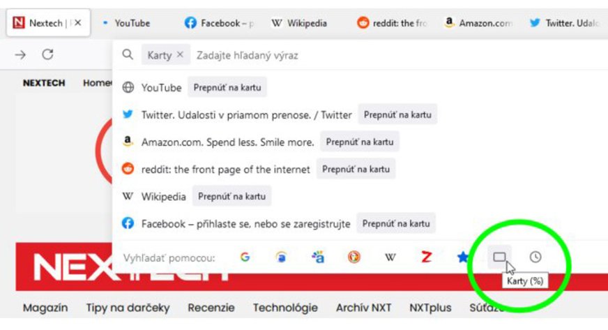 Rovnaké vyhľadanie možno urobiť aj v prehliadači Mozilla Firefox, i keď trochu iným spôsobom. Môžete použiť adresný riadok. Stačí naň kliknúť, čím sa vysunie doplnková ponuka vyhľadávačov. Štandardne tu uvidíte ikony Googlu a iných, ktoré ste si do zoznamu sami pridali. Na konci zoznamu sa však nachádza ikona štvorca, ktorá reprezentuje karty/ušká. Po jej vybratí stačí do adresného riadka zadať nejaký text a vyhľadané ušká/karty, ktoré ho majú vo svojom názve, sa zobrazia. To všetko sa dá aj bez klikania. Podobne ako jednotlivé vyhľadávače aj hľadanie medzi uškami/kartami má svoj operátor, ktorým je znak percenta. Ak teda zadáte %nextech, zobrazia sa ušká s týmto názvom. Pokiaľ potrebujete namiesto názvu otvorených stránok hľadať rovno v ich textovom obsahu, na tento účel už budete potrebovať špecializovaný doplnok. V rámci Google Chrome a takisto Firefoxu môžete použiť totožný doplnok Search all Tabs.