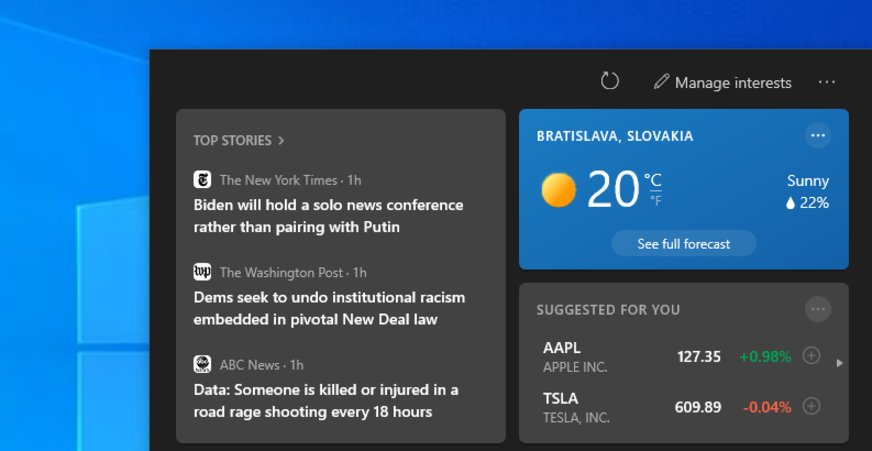 Po kliknutí sa vysunie nový informačný panel, obsahujúci aktuálne správy zo sveta, športu, trhov a iných oblastí. Kliknutím na ikonu Manage interests (Spravovať záujmy) sa otvorí webová stránka Microsoft News, ktorá je zdrojom dát daného panela, kde si budete môcť vybrať konkrétne položky, ktoré chcete sledovať.