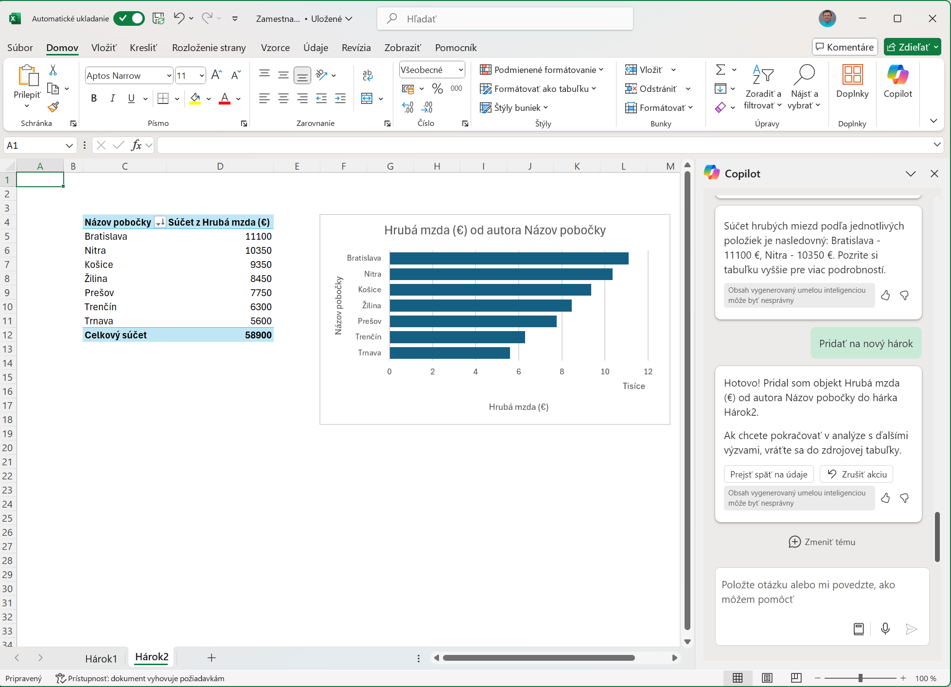 Skúsenejší používatelia Excelu vedia, že riešením tohto zadania je vytvorenie kontingenčnej tabuľky. V konečnom dôsledku však potrebujete tabuľku, prípadne aj graf súčtu miezd pracovníkov jednotlivých položiek, ale nemusíte vedieť, že ide o kontingenčnú tabuľku alebo kontingenčný graf, a ani to, ako sa takáto tabuľka či graf vytvára. Copilot to urobí za vás. Tabuľku aj graf, o ktorý ste síce nežiadali, ale jeho názornosť väčšinou poteší, následne Copilot vloží na nový hárok.